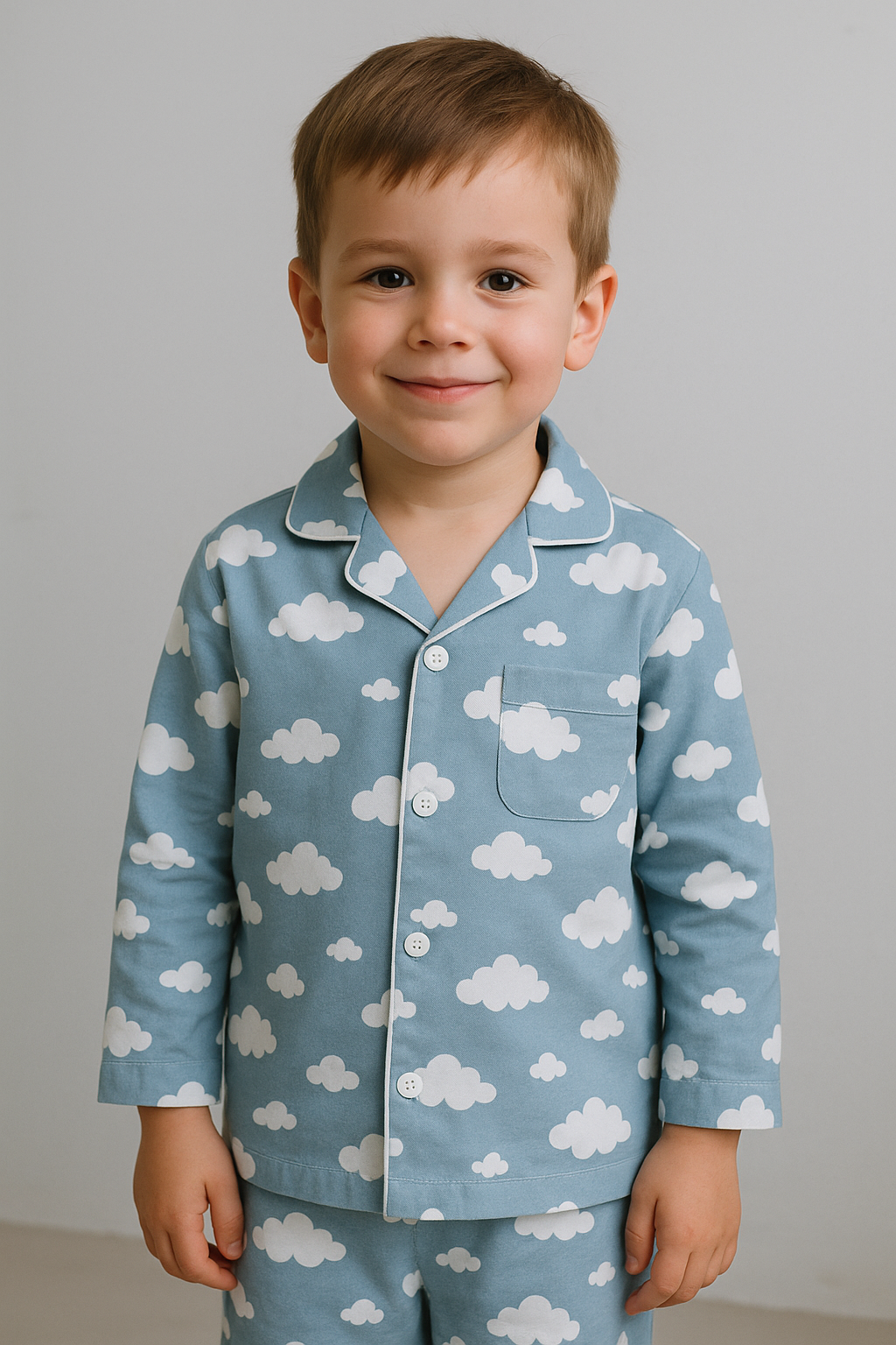 Wunderbar weicher, aber dennoch leichter Baumwollflanell, mit schönem Wolkenmuster bedruckt. Der Stoff ist wärmend und hat einen sehr angenehm weichen Griff.