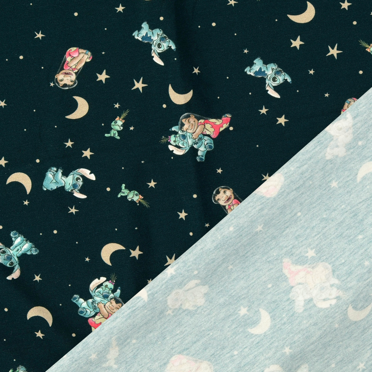 Ein geschmeidiger Jersey mit lebendigem, detailreichem Lilo-&-Stitch-Design. Die lustigen Figuren bringen sofort gute Laune und machen den Stoff ideal für fröhliche Kinder- und Freizeitmode.