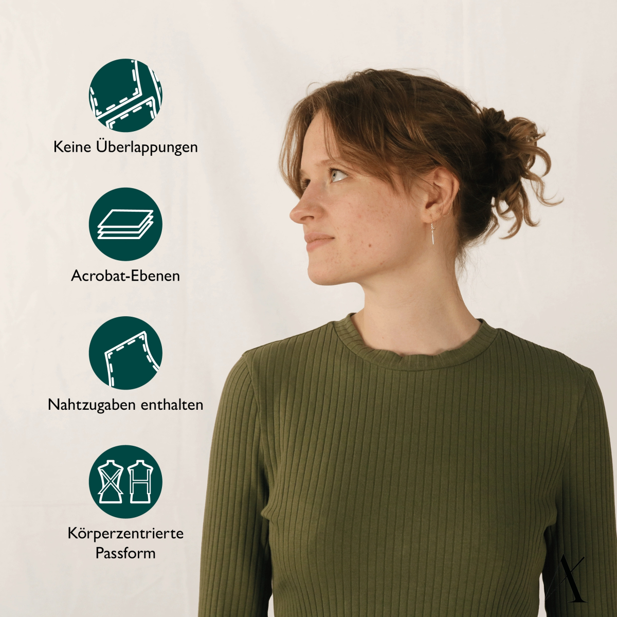 Das Schnittmuster ist in den Größen XXS bis XXL erhältlich und orientiert sich an Deiner Körperform. Die