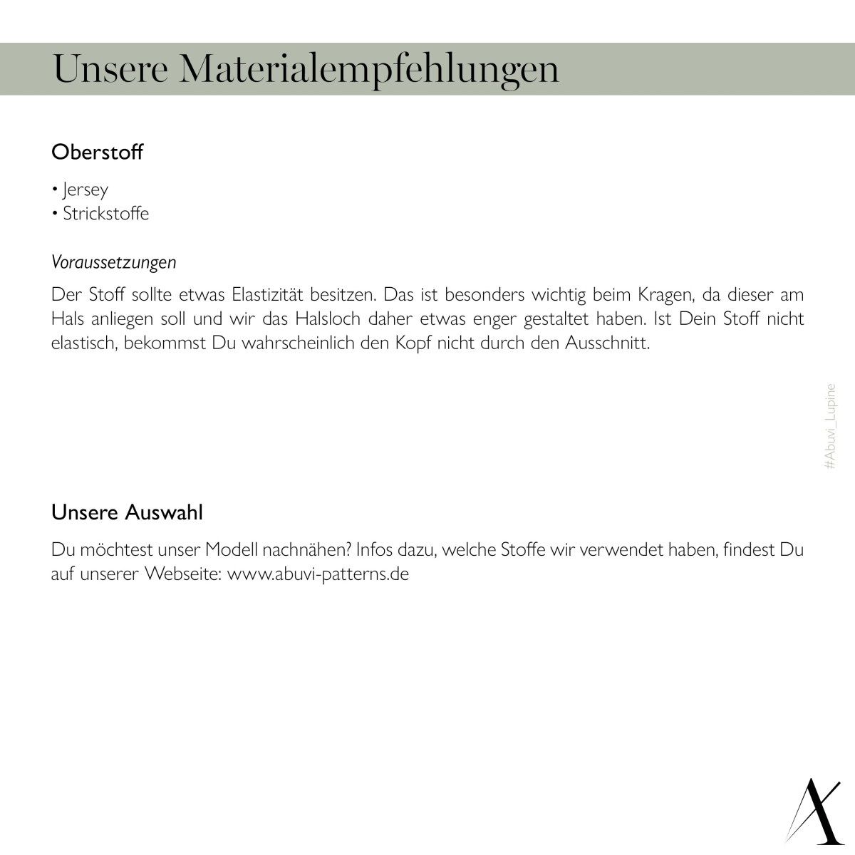 - einen Auszug aus unserem Handbuch mit Hinweisen zu Passform und Verarbeitung