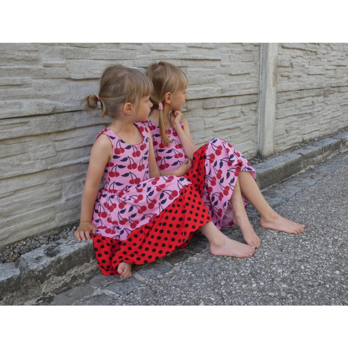 Mit dem digitalen Schnittmuster in den Größen 110-152 können zwei unterschiedliche Varianten des Rocks und 3 Varianten für ein Oberteil genäht werden.
