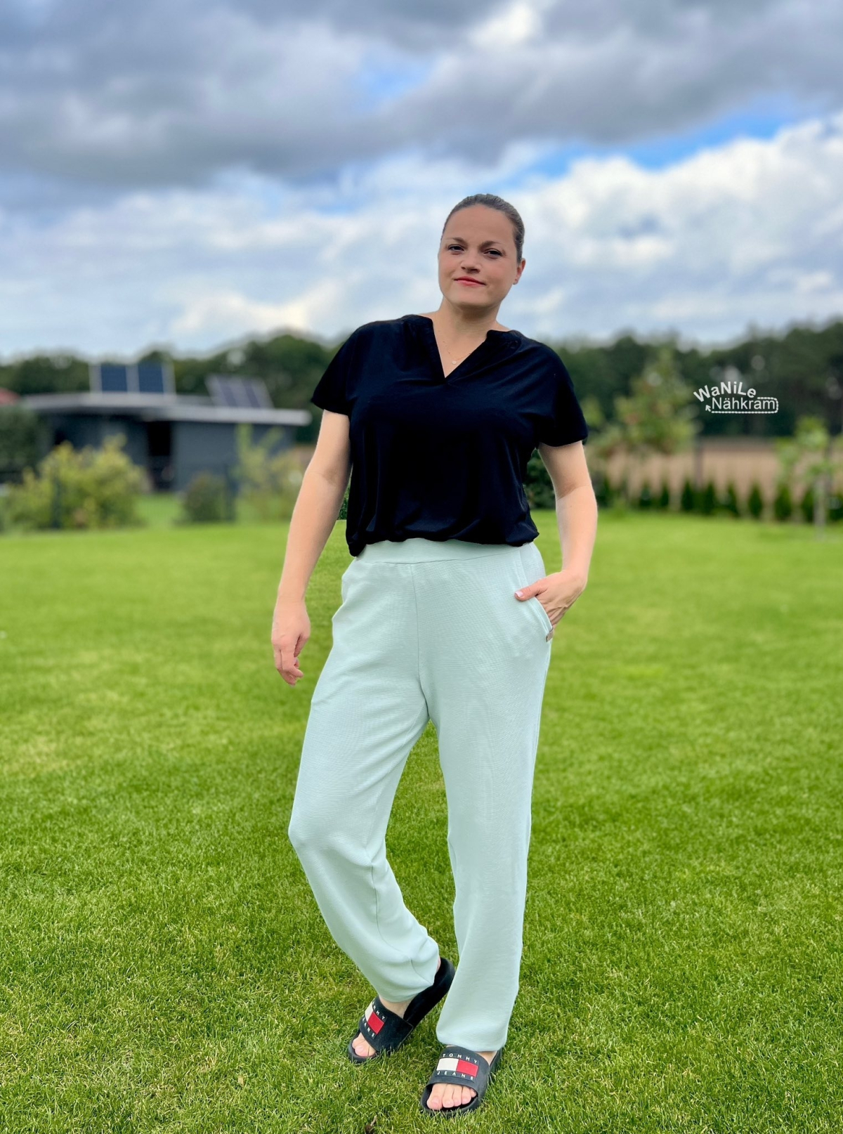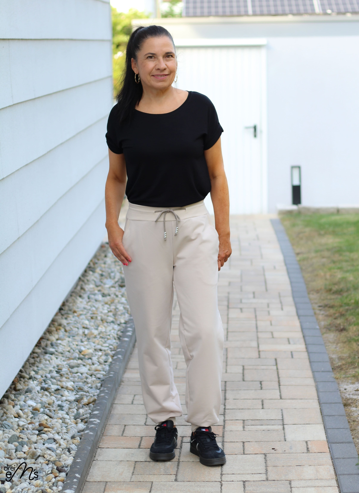 - Falls du keinen Bündchenabschluss möchtest und lieber eine gerade geschnittene Hose nähst, empfehle ich dir das Schnittmuster MOENA – perfekt für einen cleanen, klassischen Stil.