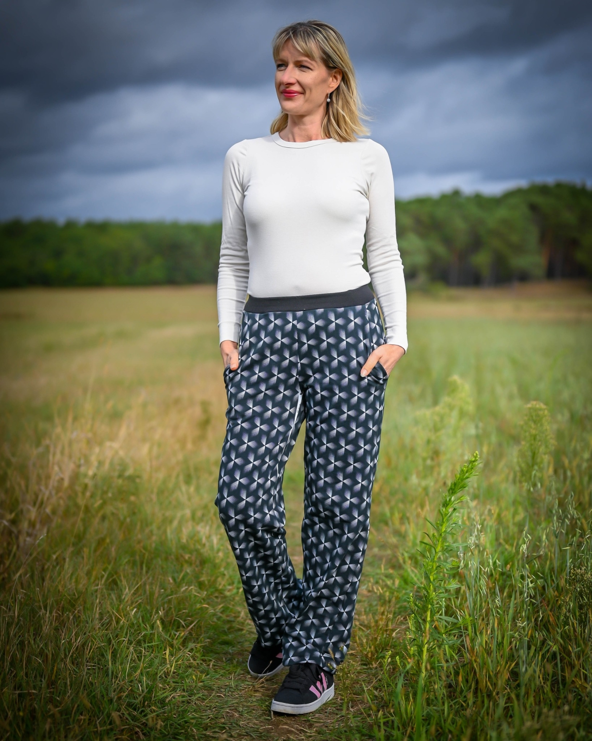 Die Hose MOENA ist eine bequeme, vielseitige und zeitlose Hose, die sich perfekt für entspannte Alltagslooks, sportliche Kombinationen oder gemütliche Stunden zu Hause eignet. Sie überzeugt durch ihren angenehmen Sitz und viele Gestaltungsvarianten – und bietet dir vor allem eins: maximale Freiheit beim Nähen.