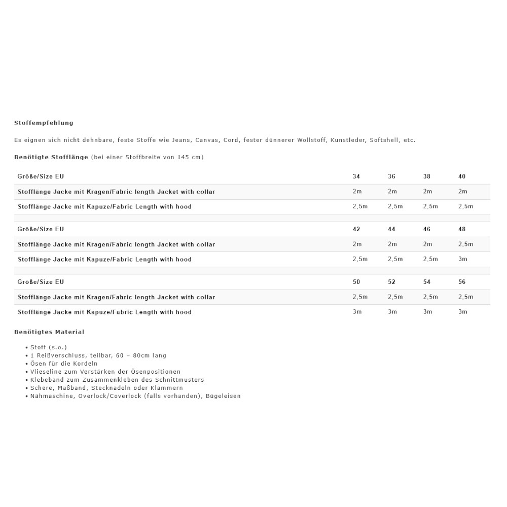 Stoffempfehlung: Es eignen sich nicht dehnbare, feste Stoffe wie Jeans, Canvas, Cord, fester dünnerer Wollstoff, Kunstleder, Softshell, etc.