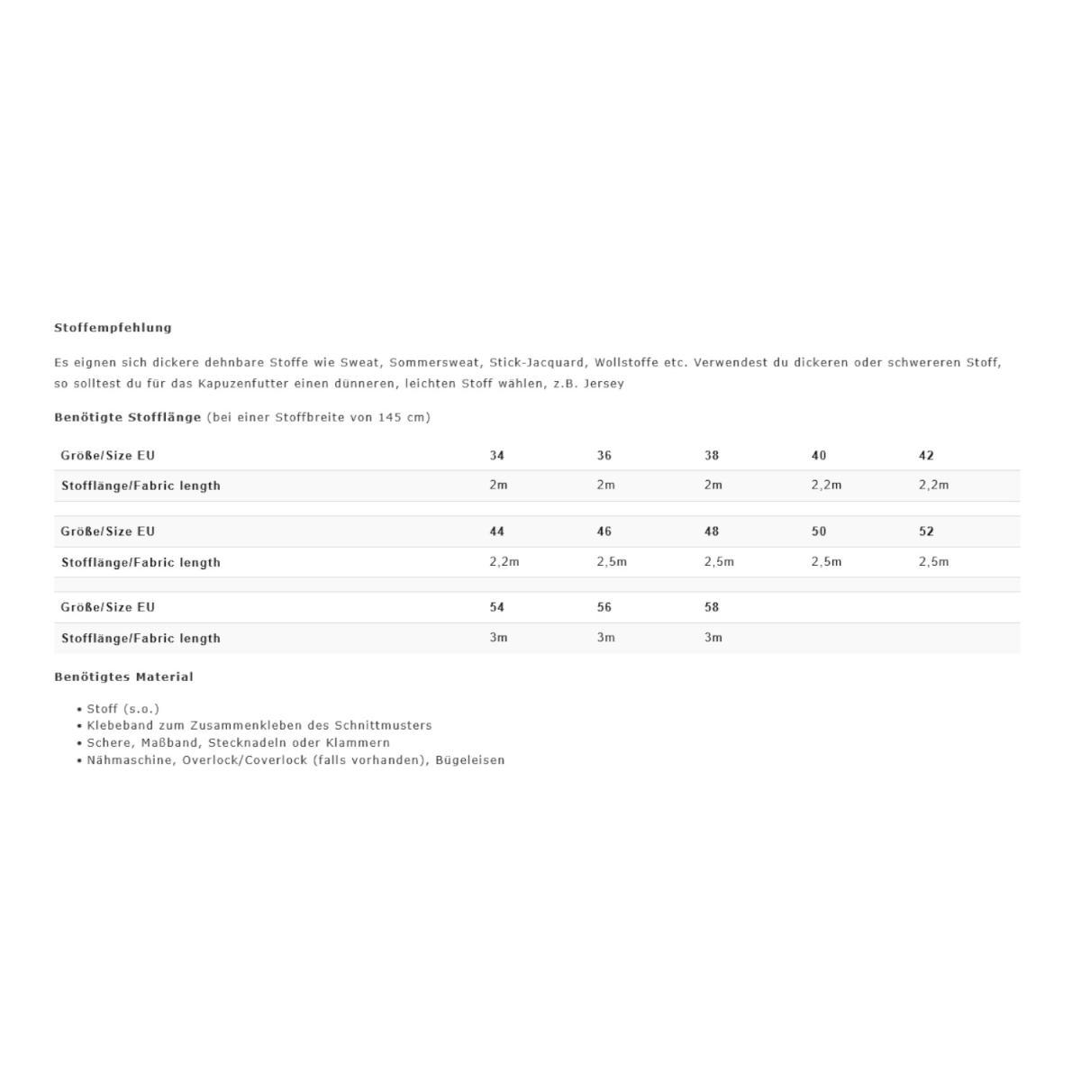 Stoffempfehlung Es eignen sich dickere dehnbare Stoffe wie Sweat, Sommersweat, Stick-Jacquard, Wollstoffe etc. Verwendest du dickeren oder schwereren Stoff, so solltest du für das Kapuzenfutter einen dünneren, leichten Stoff wählen, z.B. Jersey