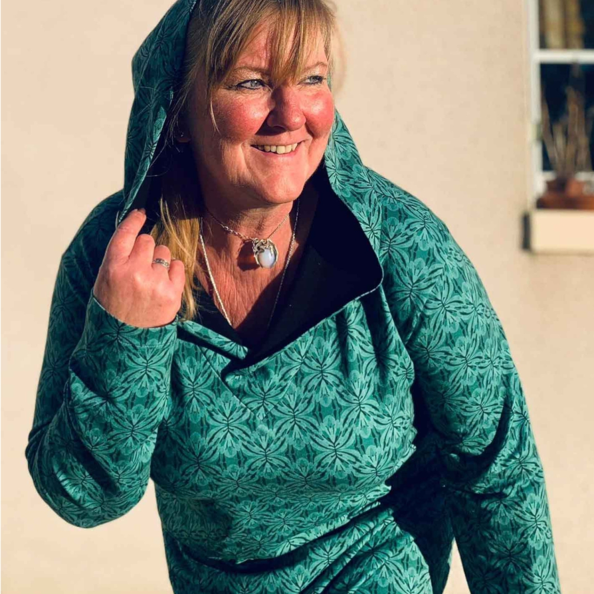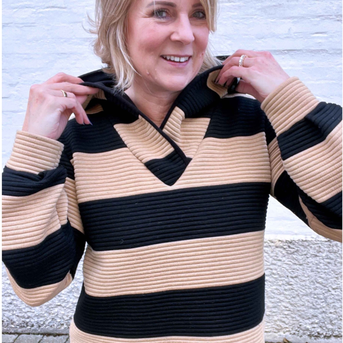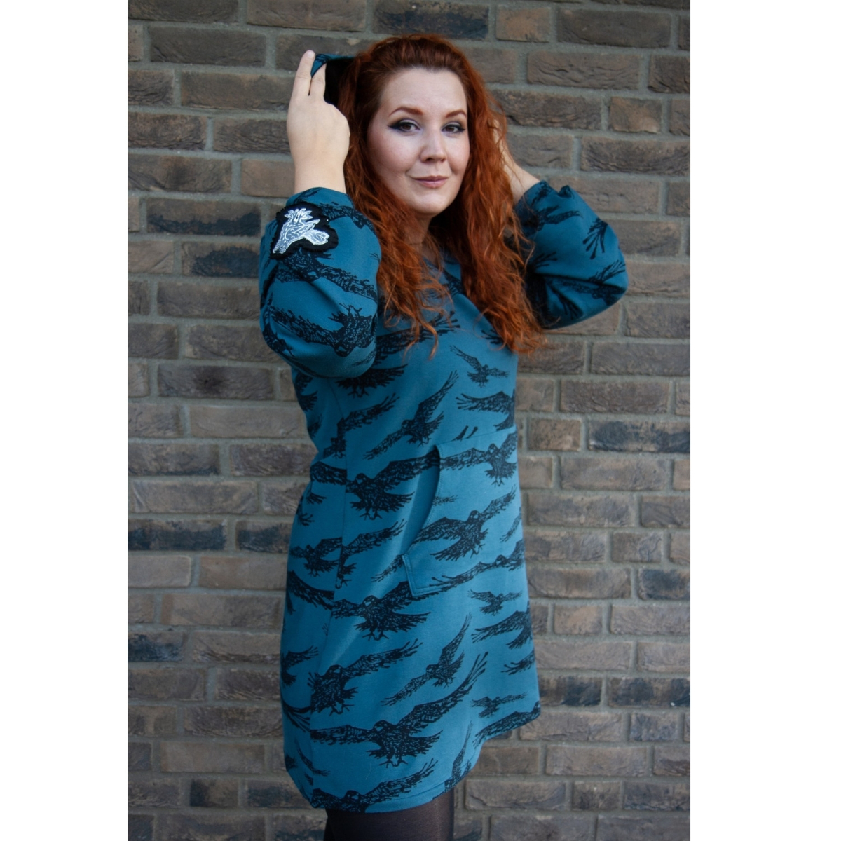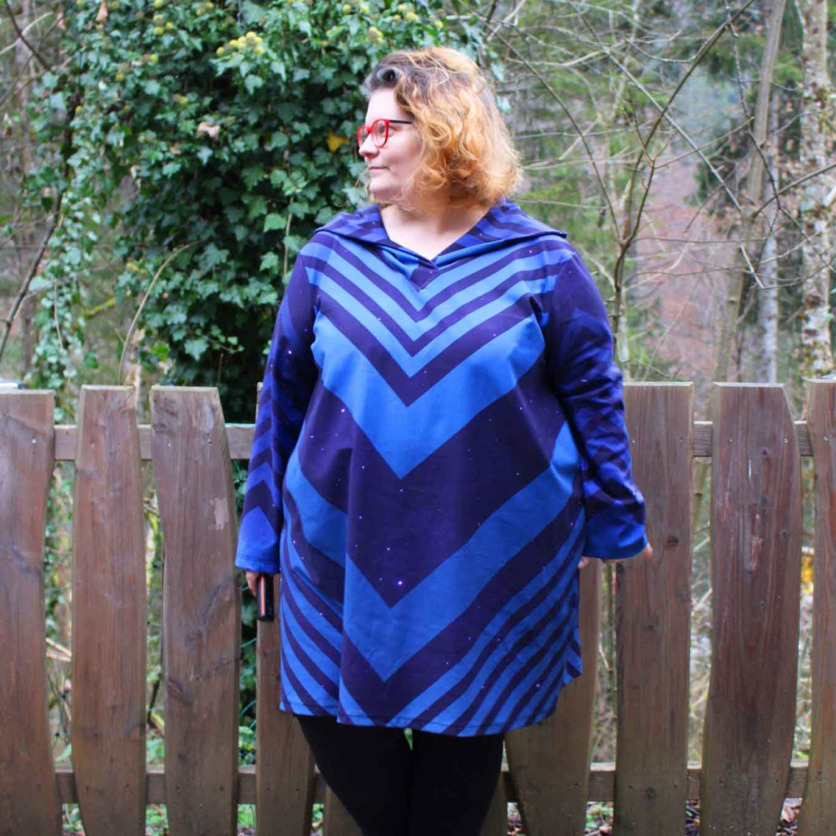 Cacau ist ein Pulloverkleid mit zwei Ärmelvarianten und drei Kragenvarianten. Gewählt werden kann zwischen langen, schmalen Ärmeln und Trompetenärmeln (Bischofsärmeln) mit Bündchenmanschetten. Der große V-Ausschnitt kann mit Beleg oder überlappendem Schalkragen genäht werden. Alternativ kannst du auch den übergroße Kapuzenkragen wählen. Der Schnitt fällt gerade und leicht ausgestellt, im Schnittmuster sind optionale Nahttaschen sowie eine Bauchtasche enthalten. Zum Vernähen eignen sich dickere, dehnbare Stoffe wie Sweat, French Terry, Strick-Jacquard, etc.
