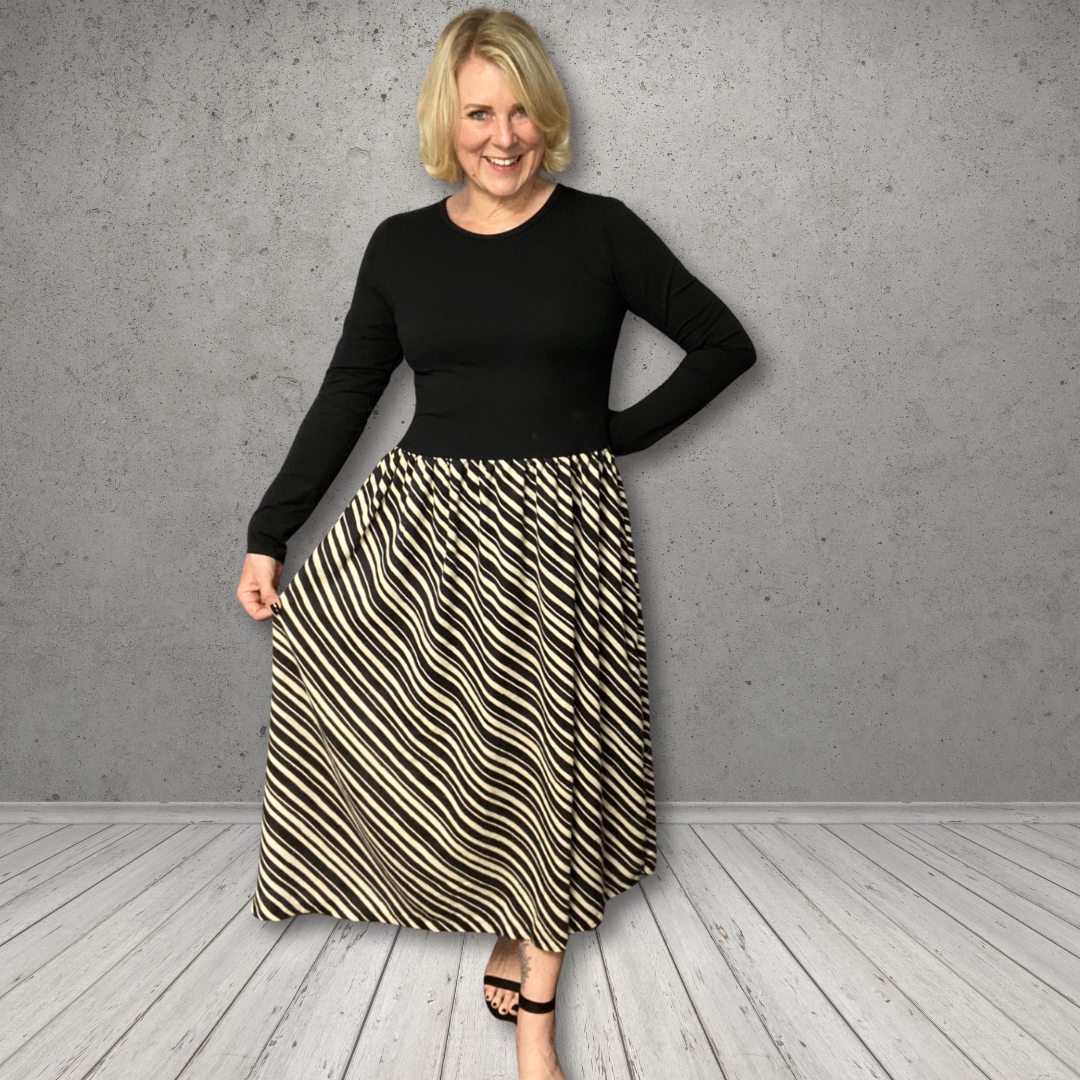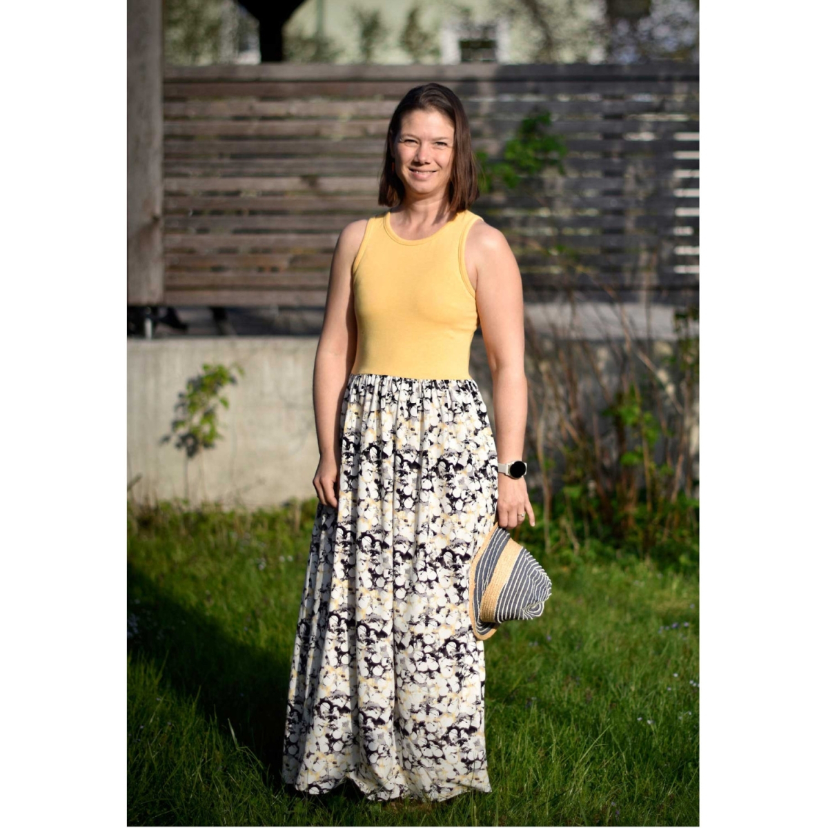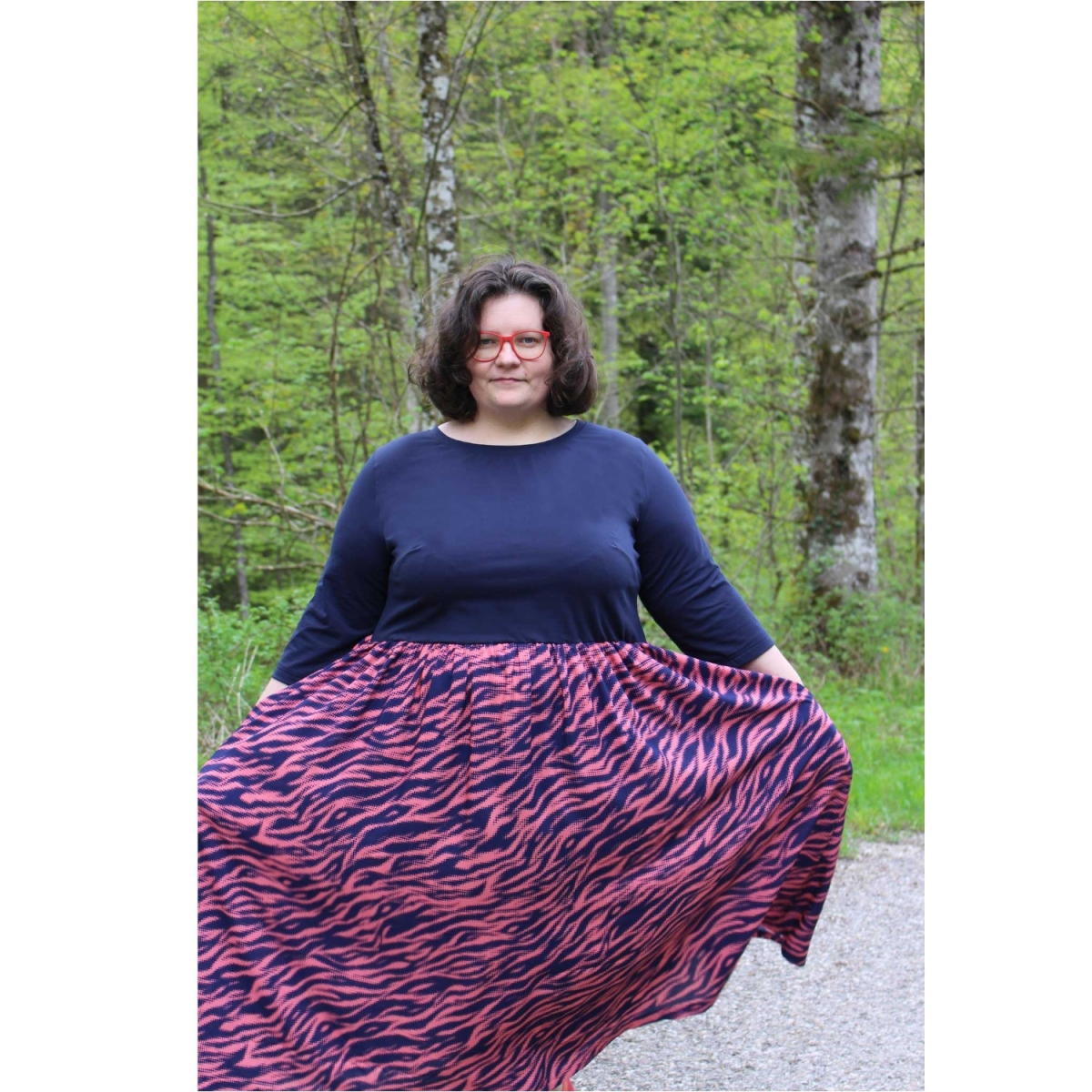 Suzana ist ein luftiges Kleid mit figurnahem Oberteil und locker schwingendem Rock. Das Oberteil wird aus dehnbaren Stoffen genäht, der Rock aus Webware. Das Schnittmuster enthält Taschen. Da der Rock gekräuselt an das Oberteil genäht wird, können (falls nötig) auch verschiedene Größen kombiniert werden. Das Schnittmuster enthält zwei Oberteilvarianten: ein ärmelloses Top und ein Oberteil mit Brustabnähern und verschiedenen Ärmellängen.