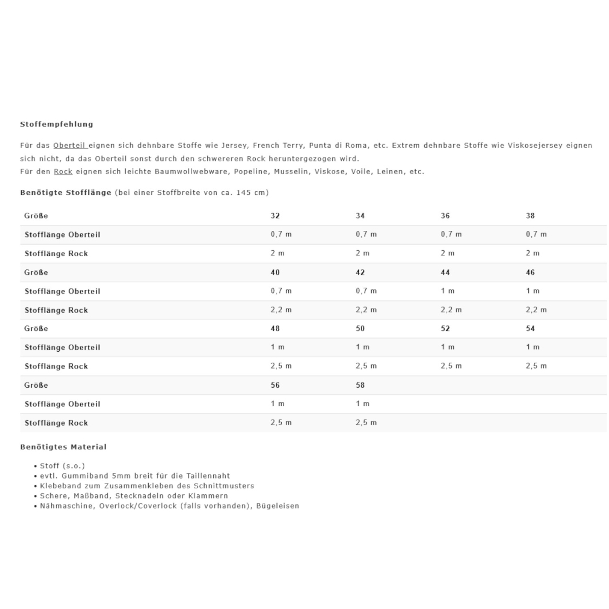 Für das Oberteil eignen sich dehnbare Stoffe wie Jersey, French Terry, Punta di Roma, etc. Extrem dehnbare Stoffe wie Viskosejersey eignen sich nicht, da das Oberteil sonst durch den schwereren Rock heruntergezogen wird. Für den Rock eignen sich leichte Baumwollwebware, Popeline, Musselin, Viskose, Voile, Leinen, etc.