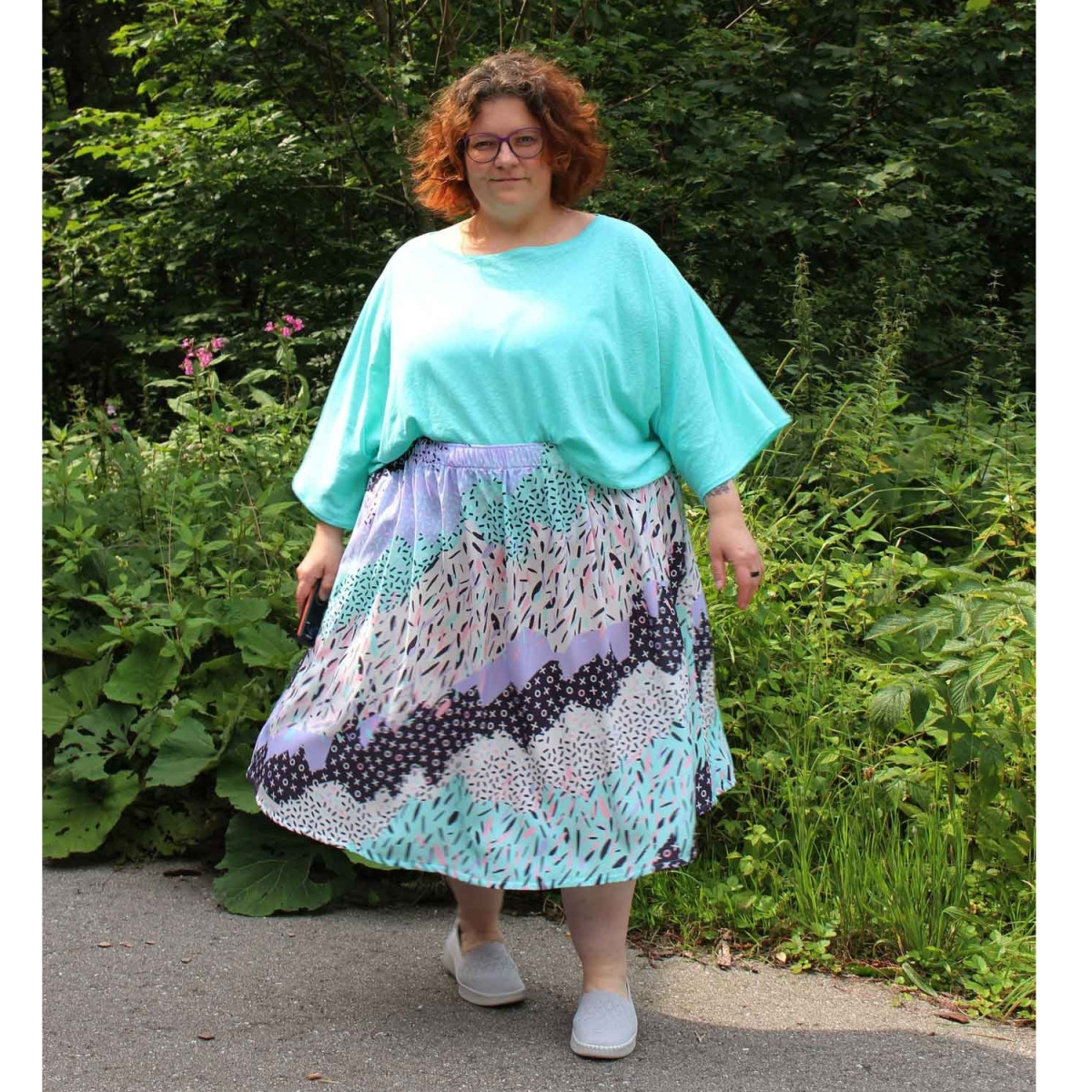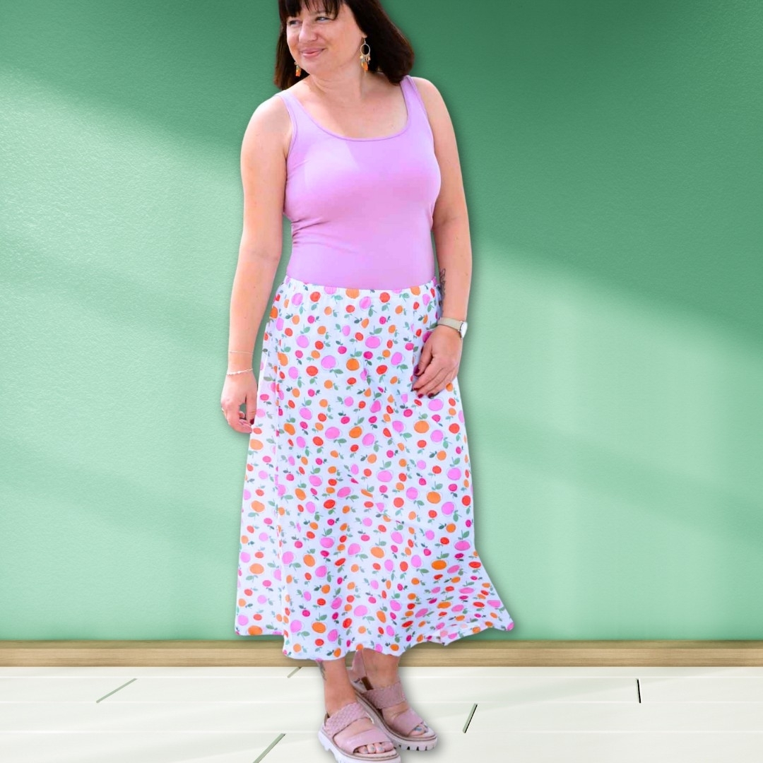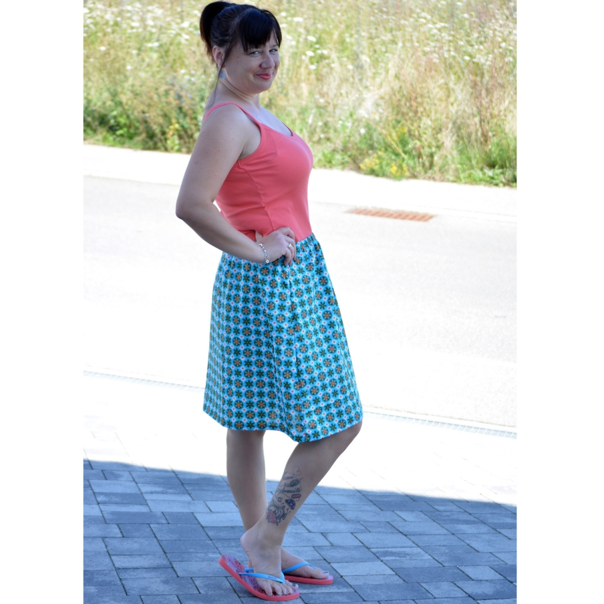 Rosa ist ein schnell genähter Rock für weich fallende Webware und leichte Jerseystoffe. Der schlichte Schnitt hat einen bequemen Gummizug, der in der Taille oder auf der Hüfte getragen wird. Das Schnittmuster enthält zwei Längen (kniebedeckend und knöchellang) und fällt leicht ausgestellt.