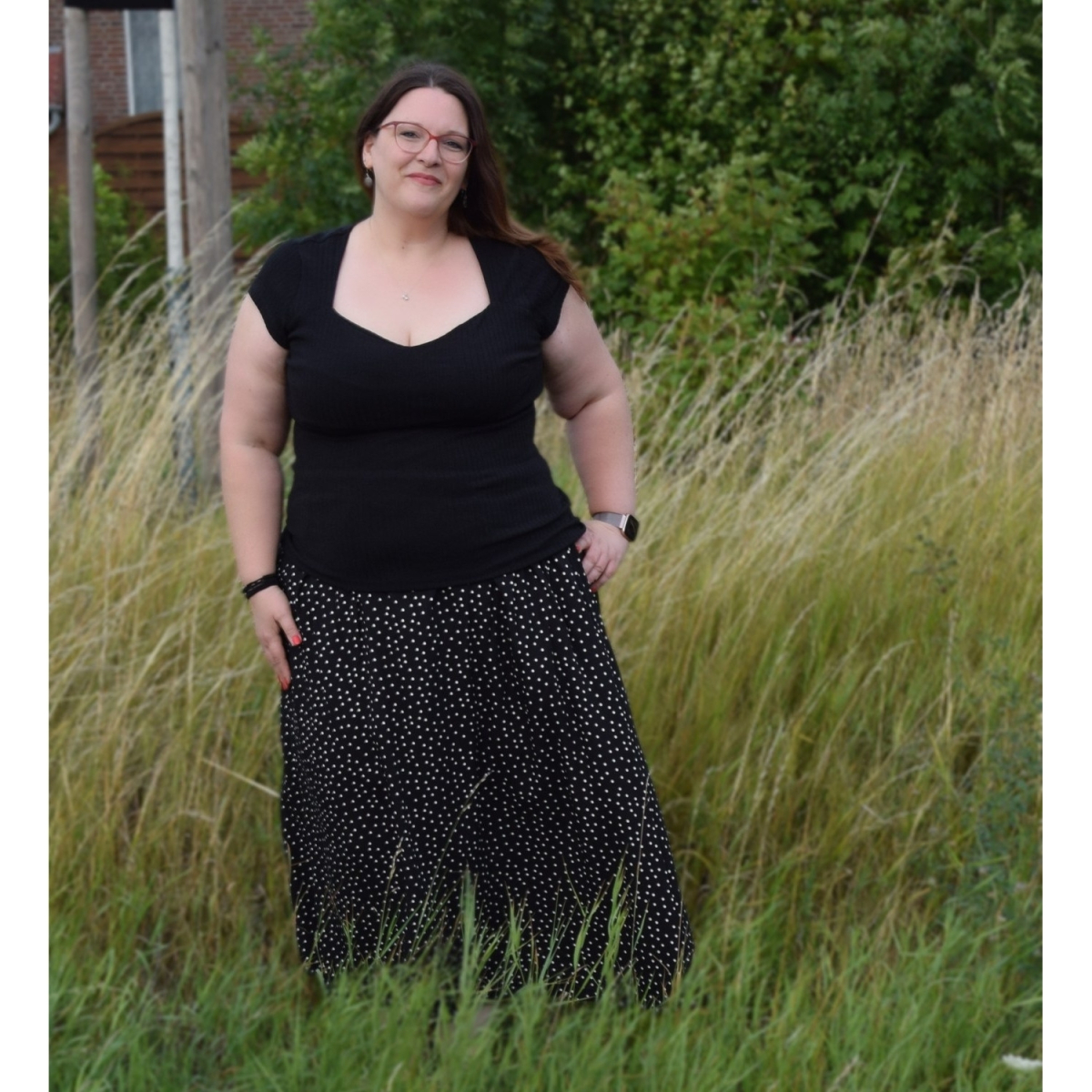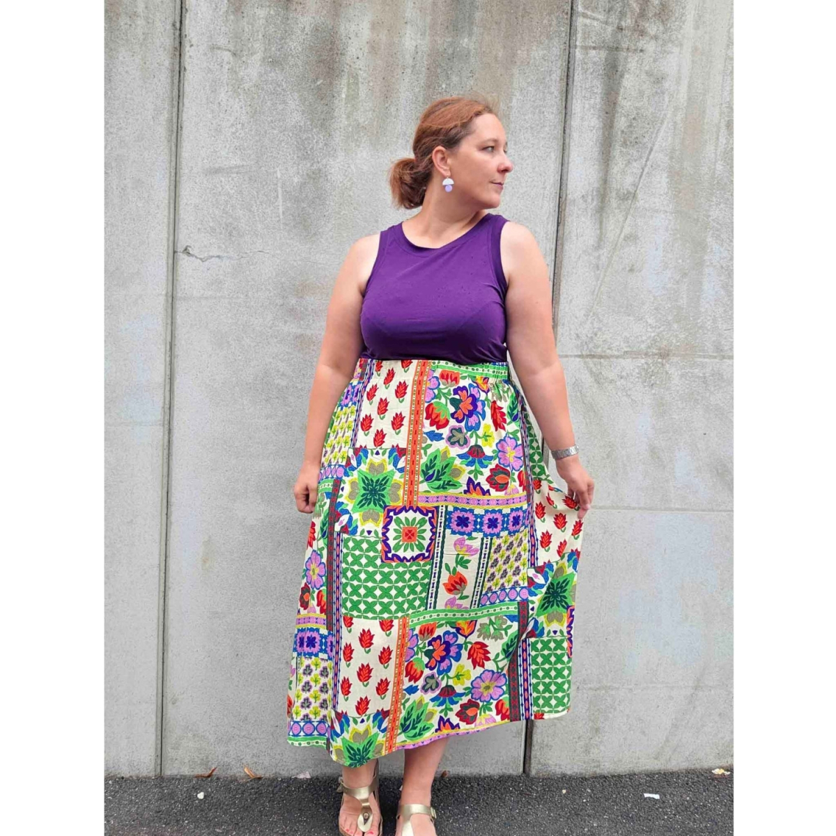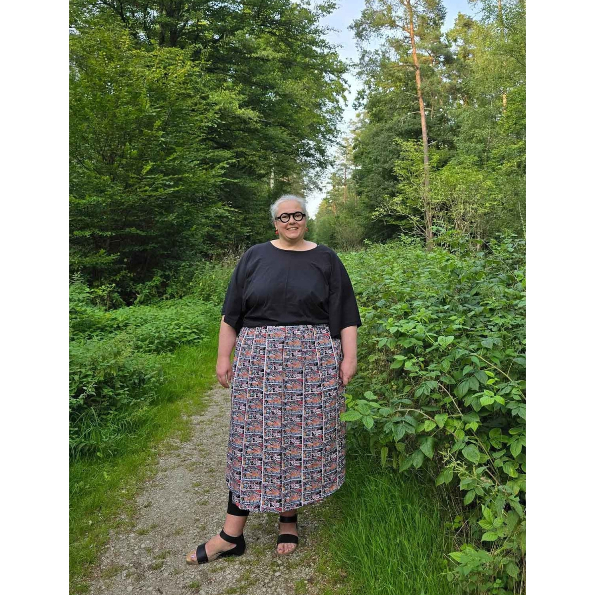 Rosa ist ein schnell genähter Rock für weich fallende Webware und leichte Jerseystoffe. Der schlichte Schnitt hat einen bequemen Gummizug, der in der Taille oder auf der Hüfte getragen wird. Das Schnittmuster enthält zwei Längen (kniebedeckend und knöchellang) und fällt leicht ausgestellt.