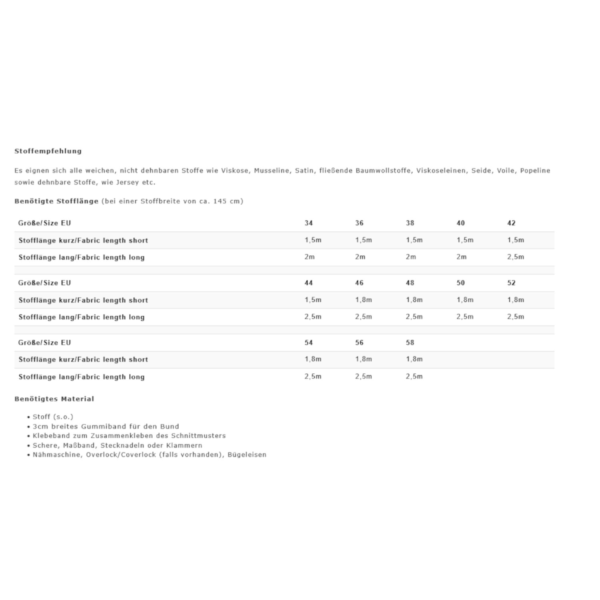STOFFEMPFEHLUNG: Weiche, nicht dehnbare Stoffe wie Viskose, Musseline, Satin, fließende Baumwollstoffe, Viskoseleinen, Seide, Voile, Popeline sowie dehnbare Stoffe, wie Jersey etc.