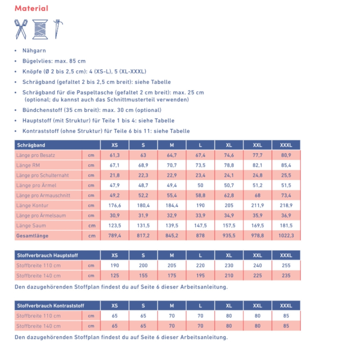 sind super Optionen für eine stylische Winterversion. Vermeide zu dünne oder geschmeidige Materialien – diese Jacke kommt am besten in Stoffen mit Körper zur Geltung, die die Silhouette und die Textur schön zur Geltung bringen. Für die kleineren Teile (z. B. Taschen, Besatz usw.) wird ein Kontraststoff ohne Struktur verwendet, z. B. Canvas oder Twill.