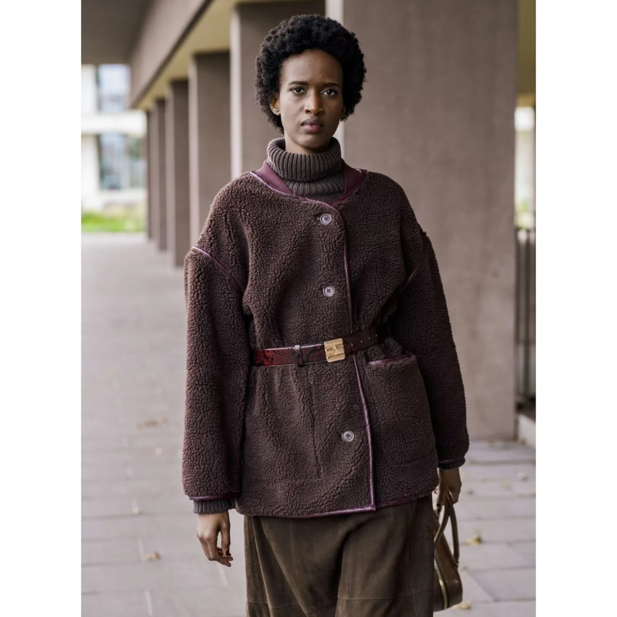 Stoffempfehlung: Wähle Teddystoff oder Mouton Retourné, um dieser Jacke ihren gemütlichen Look zu verleihen. Der weiche Flor und der voluminöse Charakter dieser Materialien betonen den lässigen, gemütlichen Effekt des Modells. Auch Bouclé oder ein weicher Filzstoff