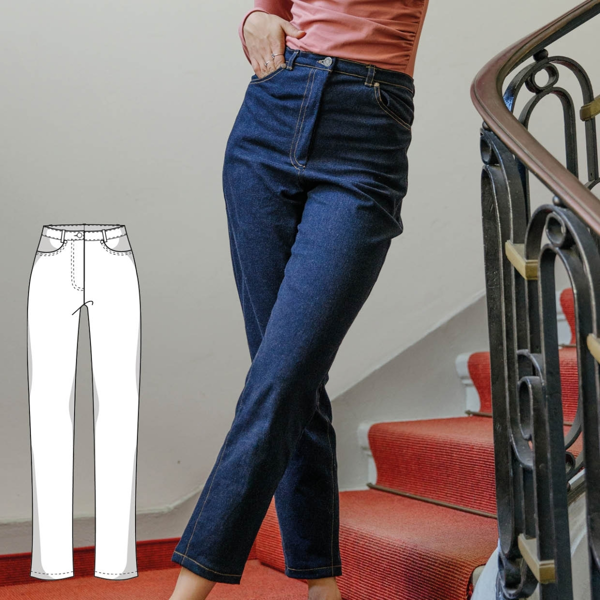 Jeans Schnittmuster zum Nähen. Mit dem Basic Jeans Schnittmuster für Damen kannst du dir eine Jeanshose mit geradem Bein nähen.