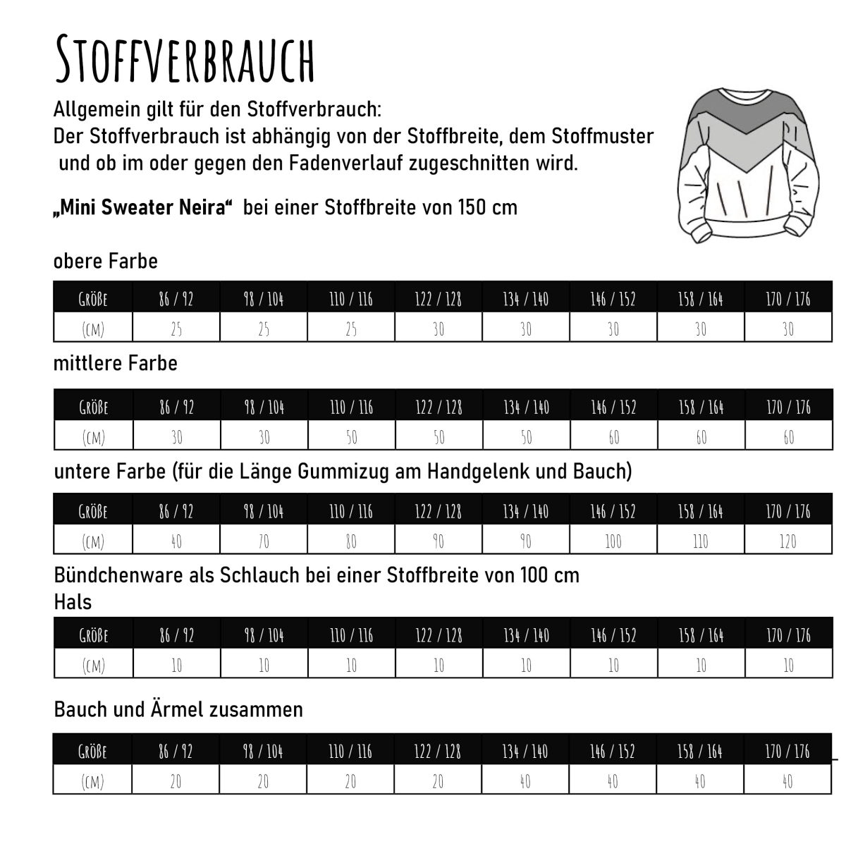 Neira lässt sich aus Strickware mit oder ohne Dehnbarkeit/ Elasthan nähen wie z.B. Winter- und Sommersweat, Heavy Joggingsweat, Kuschelsweat, Cordnicky, Stepper, Nicky etc.