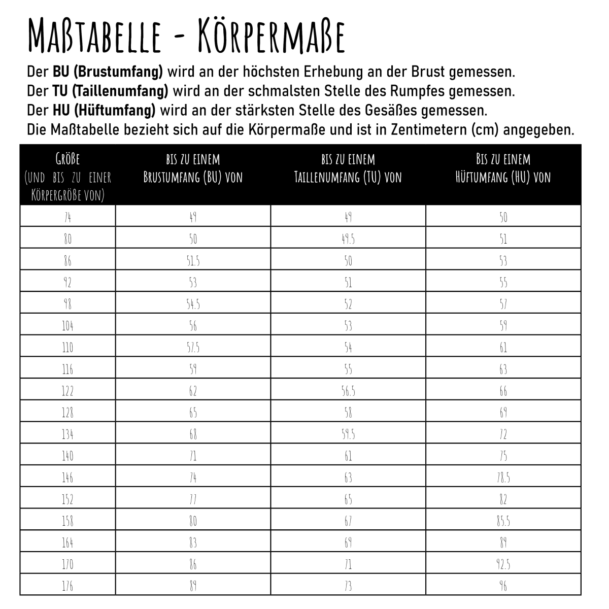 Das E-Book beinhaltet das Schnittmuster in den Größen 86 - 176 (BU 50 cm - 89 cm, HU 51 cm - 96 cm) auf A4, A0 (jeweils einmal mit und einmal ohne Naht- und Saumzugabe) und als echte Beamerdatei mit gespiegelten Schnittteilen und eine bebilderte Anleitung.