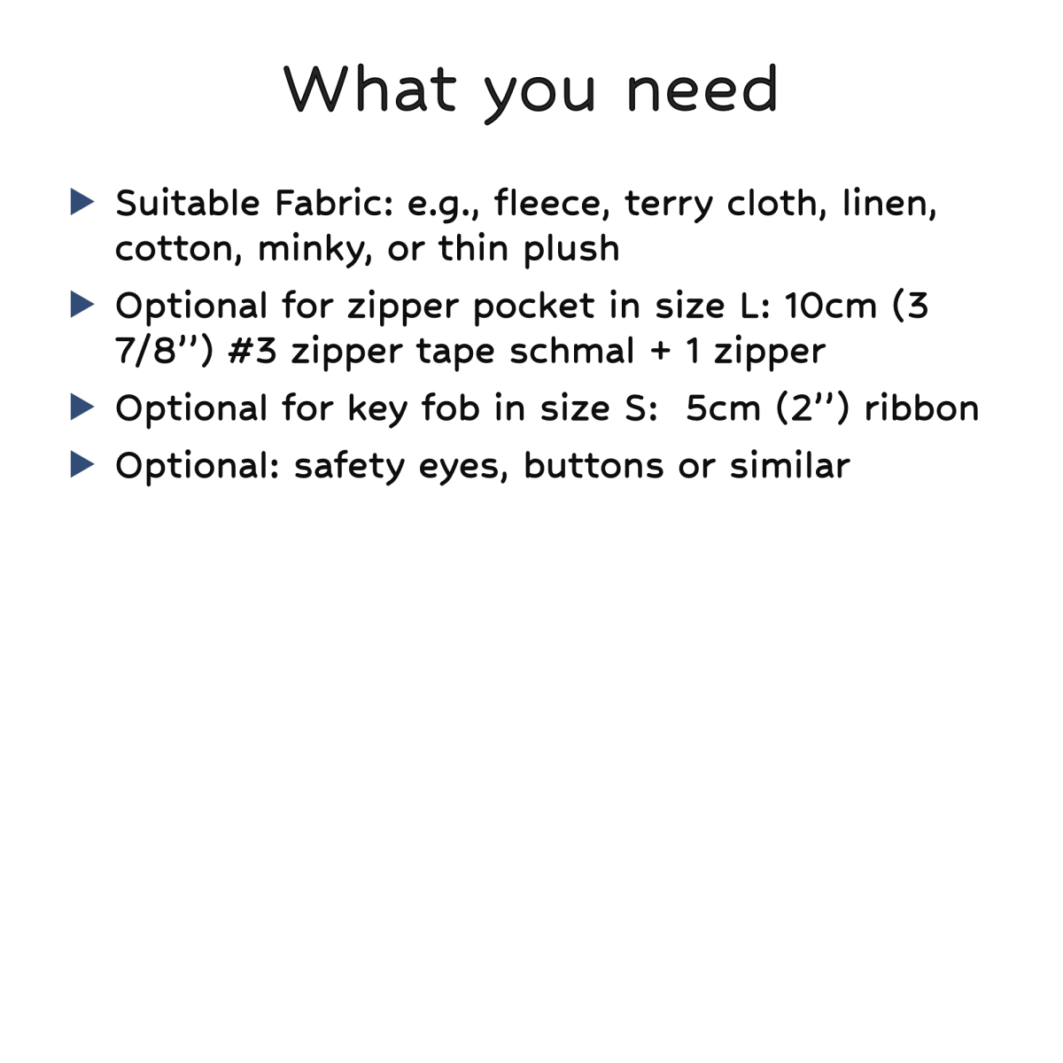 Materialempfehlung: Fleece, Frottee, Leinenstoff, Baumwoll-stoff (mit Vlies verstärkt), Nicki Stoff, Teddy-plüsch, Kuschelstoff
