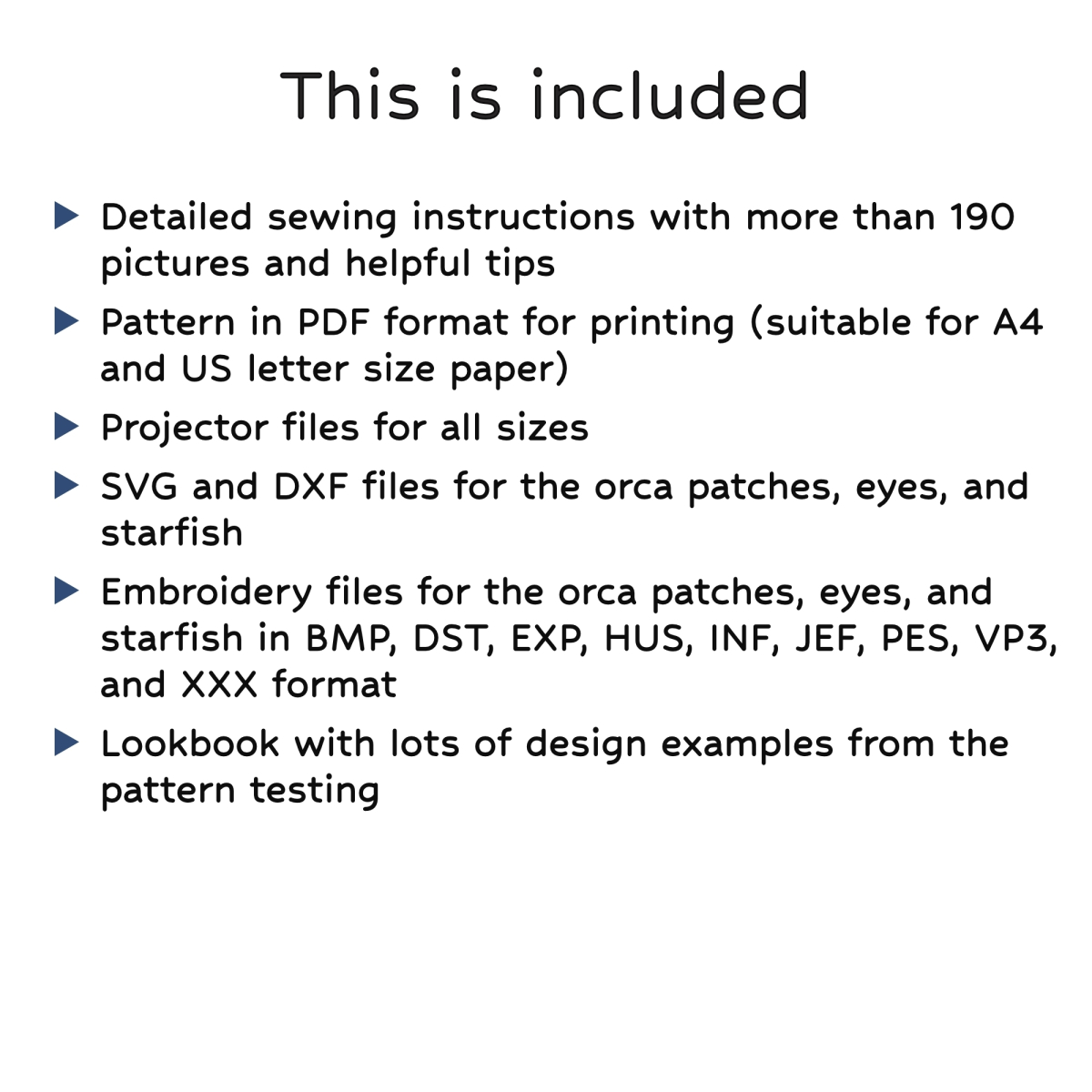 - Stickdateien für die Augen, die Orca Flecken und den Seestern im BMP, DST, EXP, HUS, INF, JEF, PES, VP3 und XXX Format