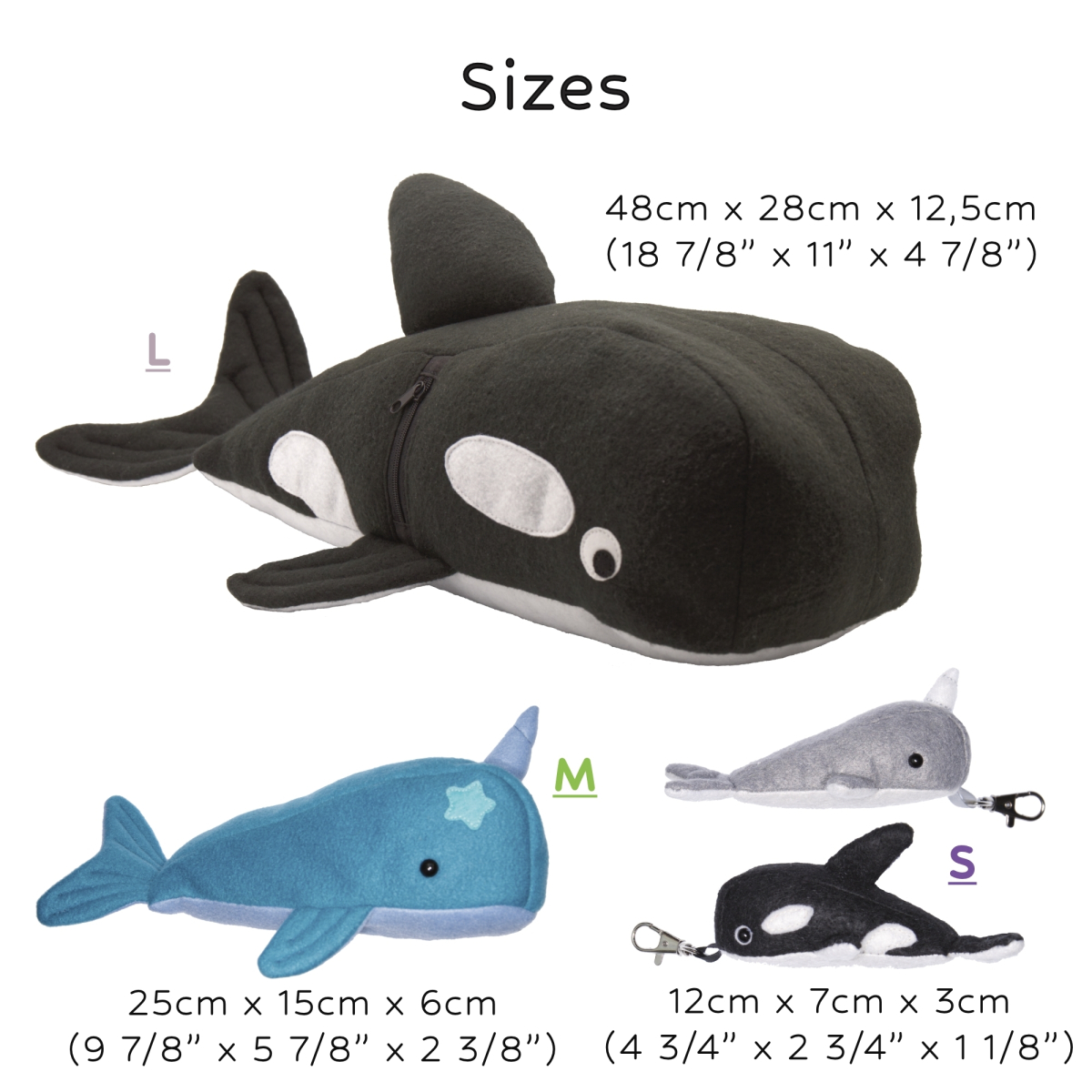 Er kann als Orca, Pottwal oder Narwal genäht und mit einem optionalen Seestern verziert werden. Rodgi ist in drei verschiedenen Größen nähbar – die kleinste eignet sich sogar als Schlüsselanhänger, und für die größte Größe kann optional ein Reißverschlussfach ergänzt werden.