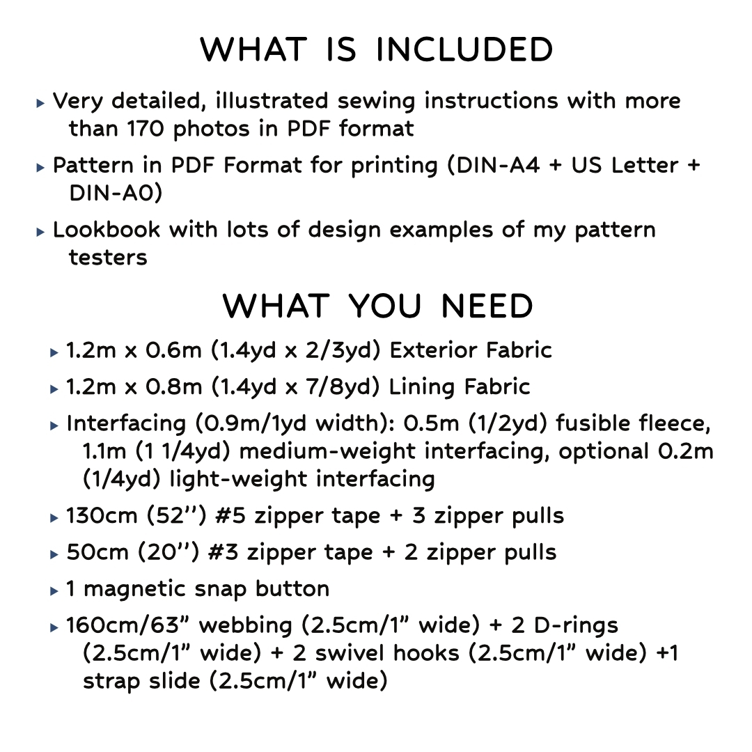 Für die äußeren Hauptteile und den Boden können alle gängigen Taschenstoffe wie Canvas, Soft- shell, Baumwollstoff oder Kunstleder verwendet werden. Für die Klappe sind leichtere Materialien wie dünnes Kunstleder oder Baumwollstoff zu empfehlen. Als Innenstoff eignet sich Baumwolle besonders gut. Zudem benötigst du S320, H640 und optional H200.