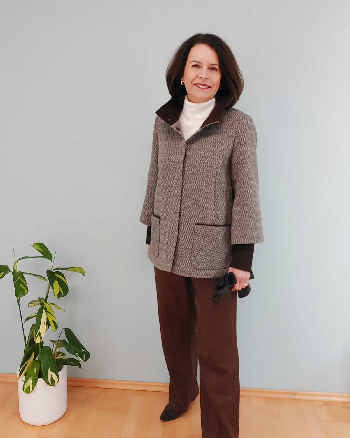 Weitere Hingucker sind die verkürzten Stoffärmel in A-Linie, mit den langen, innenliegenden Strickbündchen. Die seitlichen Teilungsnähte mit integriertem Abnäher sorgen für einen Figur-freundlichen Look und die Möglichkeit der individuellen Figur-Anpassung.