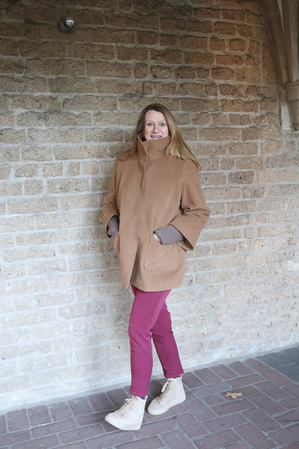 Ein Highlight bei Romy ist der großzügige Stehkragen, der hochgeschlossen und auch offen wunderbar getragen werden kann. Die verdeckte Knopfleiste gibt dem Mantel den besonderen cleanen Look.
