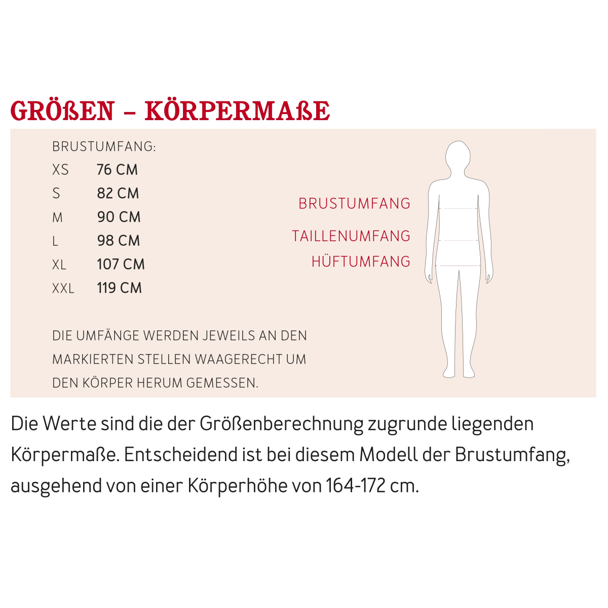 - Die Werte sind die der Größenberechnung zugrunde liegenden Körpermaße. Entscheidend bei diesem Modell ist der Brustumfang, ausgehend von einer Körperhöhe von 164-172 cm