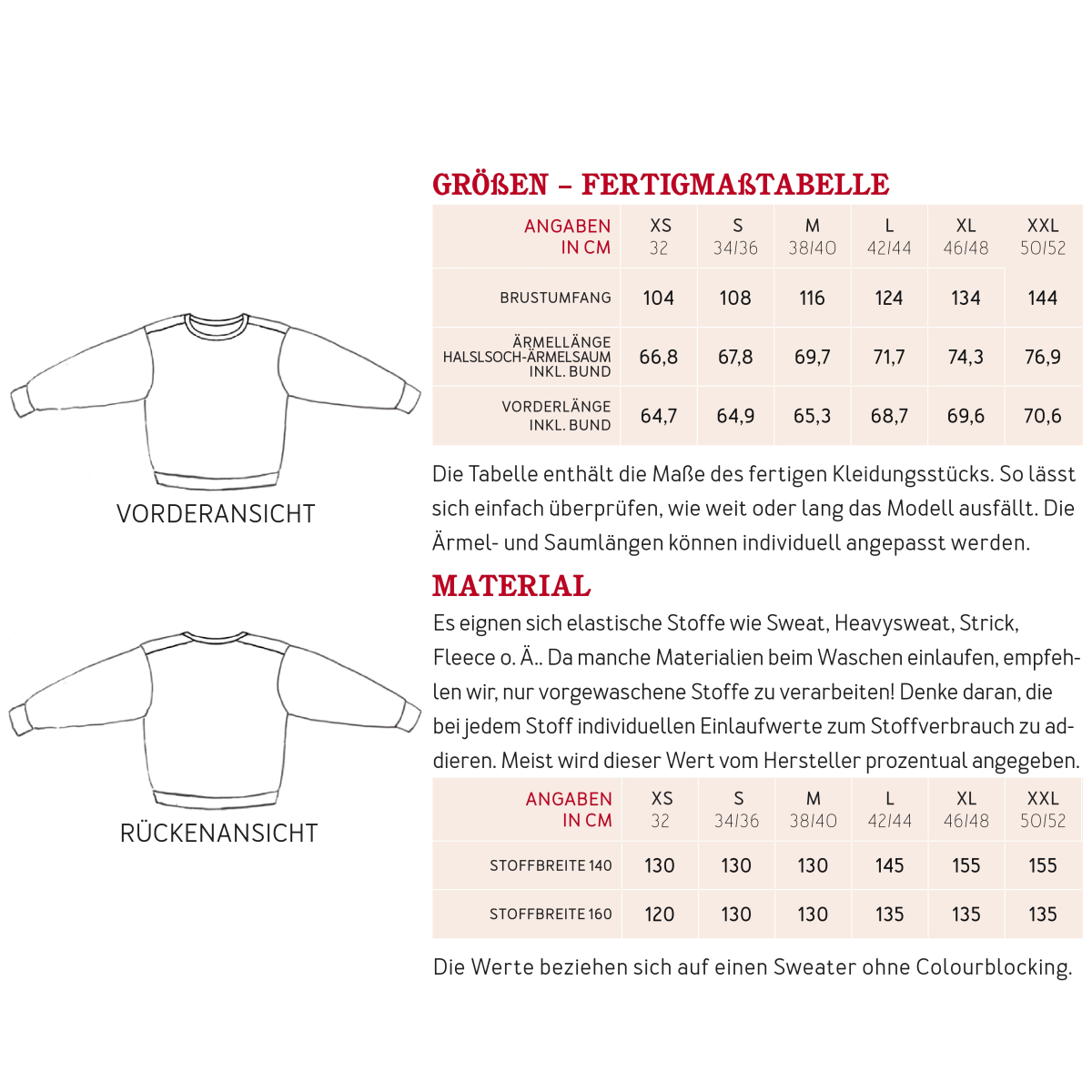 Kannst du dich auch nicht von deinen schönen Sweatresten trennen? Dann ist FRAU ALEX genau das richtige Schnittmuster für dich! Der leger geschnittene Sweater mit überschnittenen Schultern, Schulterpasse und Bündchen an Saum, Ärmeln und Halsausschnitt lädt dazu ein, Stoffreste kreativ zu kombinieren. Ob uni, kunterbunt, dezent oder im trendigen Colourblocking – jedes Teil wird zu einem einzigartigen Unikat mit überraschenden Farbkombinationen. So entsteht aus Resten dein ganz persönlicher Lieblingssweater – nachhaltig, stylisch und absolut individuell! Für Nähanfänger:innen geeignet.