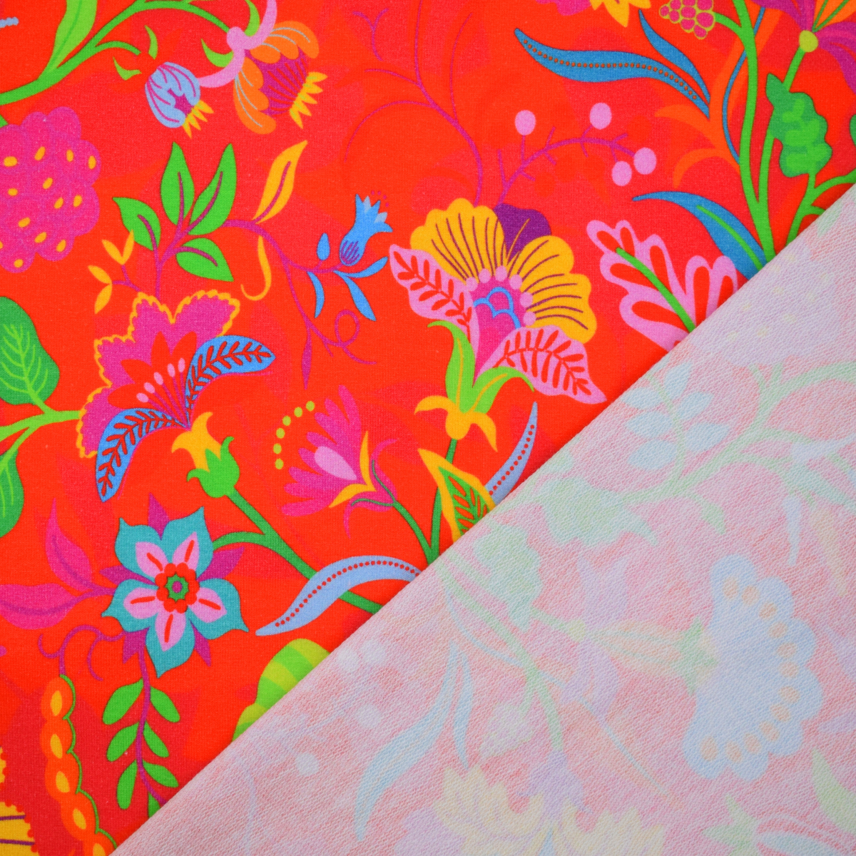 Aus diesem schönen Sommersweat, auch als French Terry bekannt, mit bunten Blumen Print zauberst du coole Hoodies, Kleider oder andere tolle Bekleidungsideen.