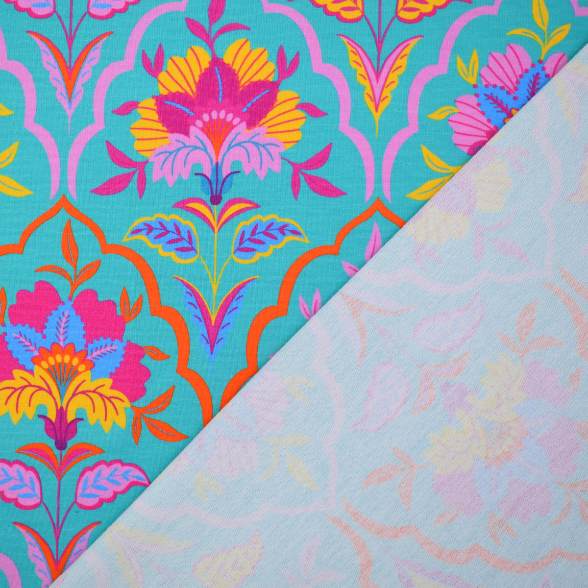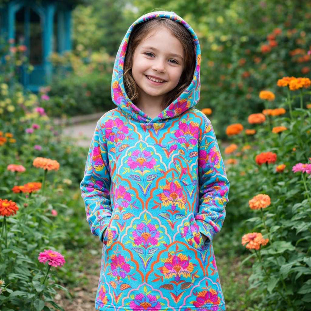 Aus diesem schönen Sommersweat, auch als French Terry bekannt, mit bunten Blumen Print zauberst du coole Hoodies, Kleider oder andere tolle Bekleidungsideen.