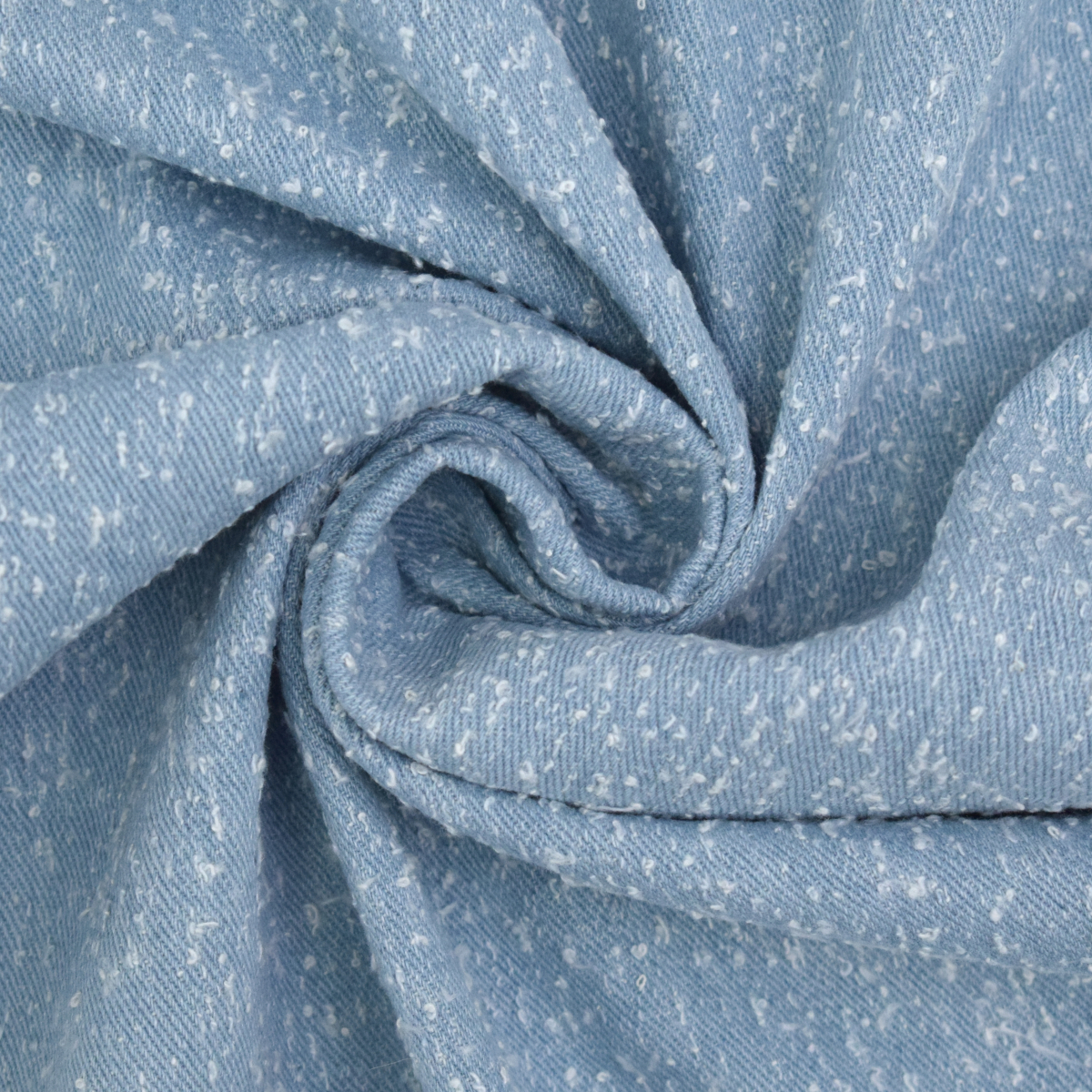 Dieser Jeansstoff mit einer außergewöhnlichen Struktur, die sich durch erhabene Knötchen auf der rechten Seite des Stoffes zeigt, eignet sich ideal für modische Bekleidung wie Jacken, Blazer oder auch für praktische Taschen oder Rucksäcke im angesagtem Denim-Look!