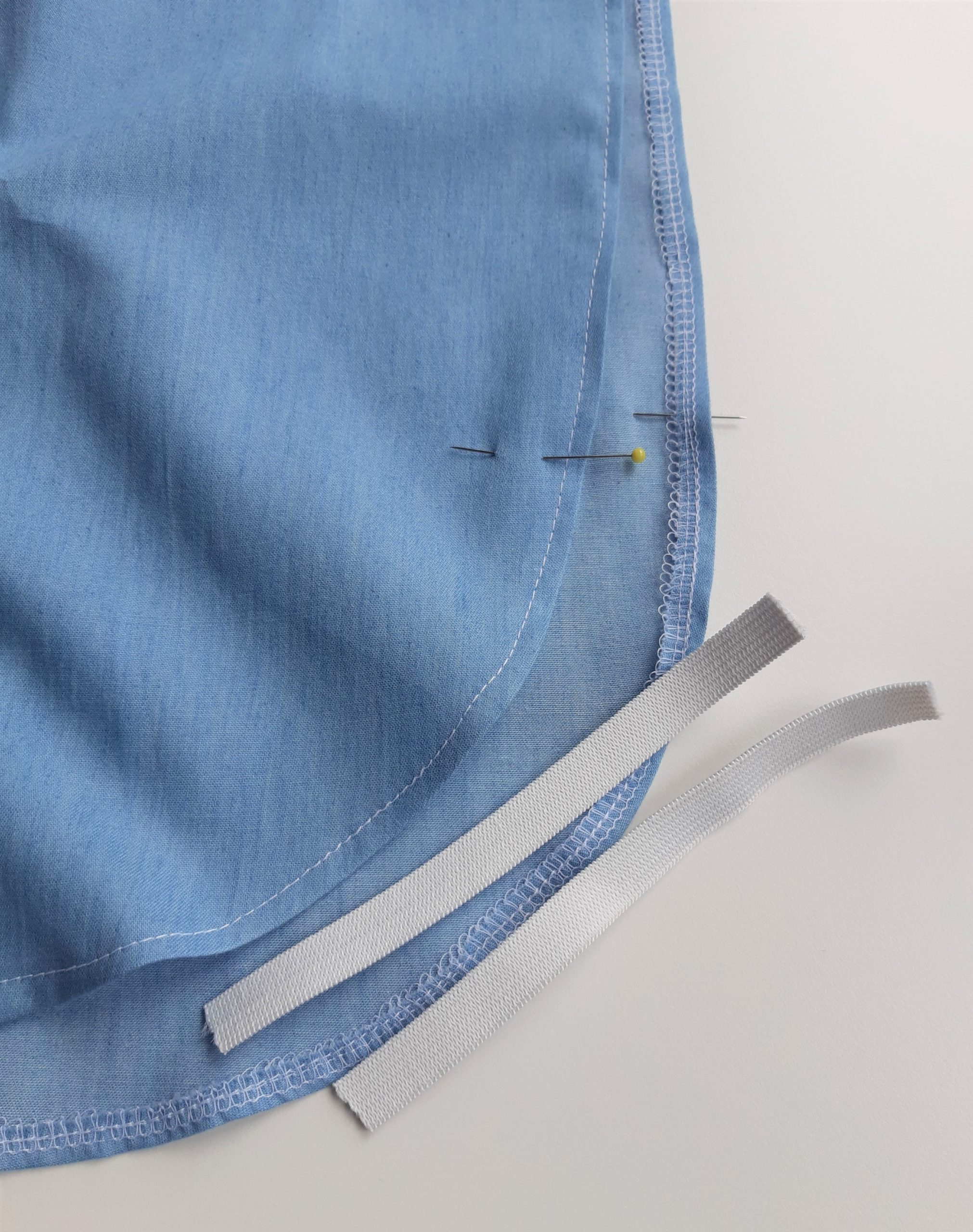 4. Fixiere die Kante am Halsausschnitt & Saum mit Stecknadeln.