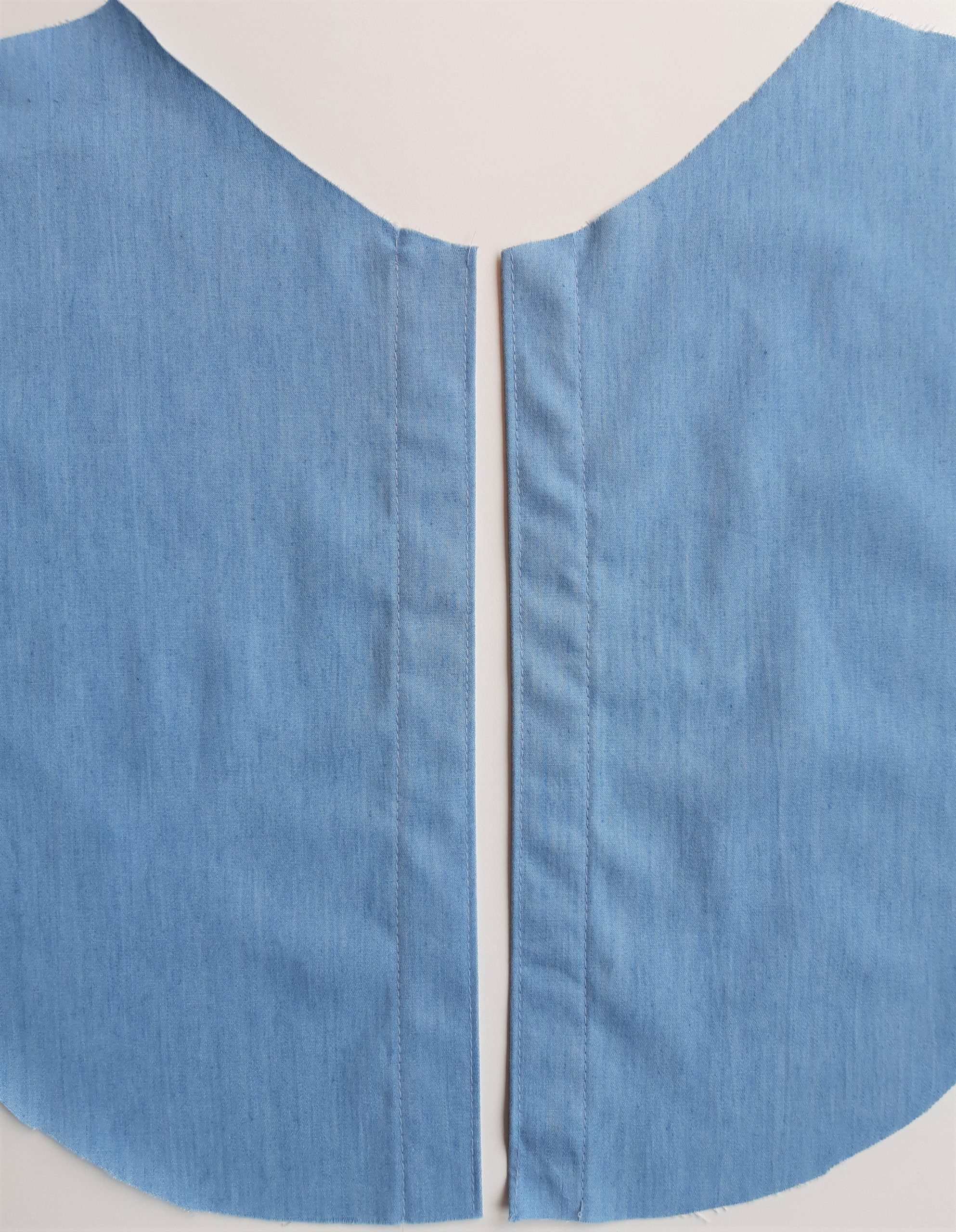 4. Bügele die versäumten Nahtzugaben von der linken Stoffseite zum Rückenschnittteil. Steppe sie von der rechten Seite ab, sodass die Nahtzugabe mit eingefasst wird.