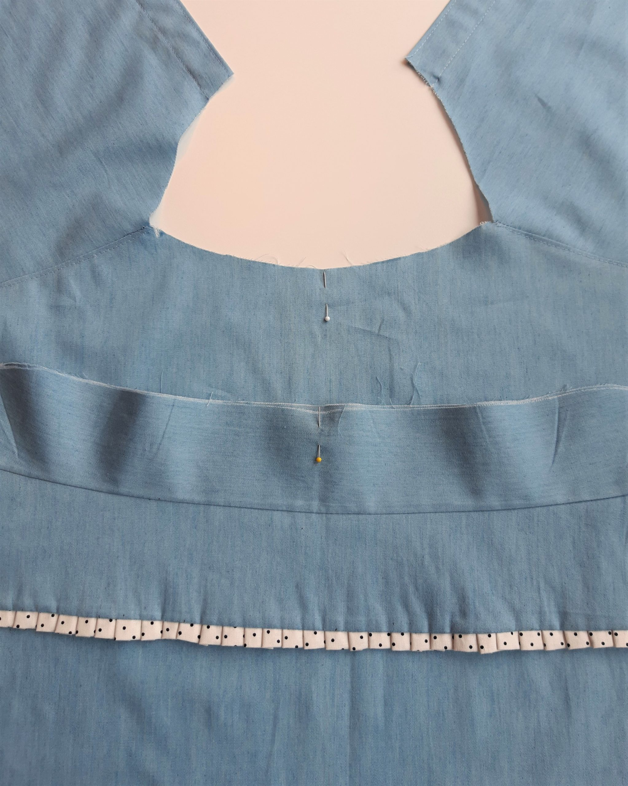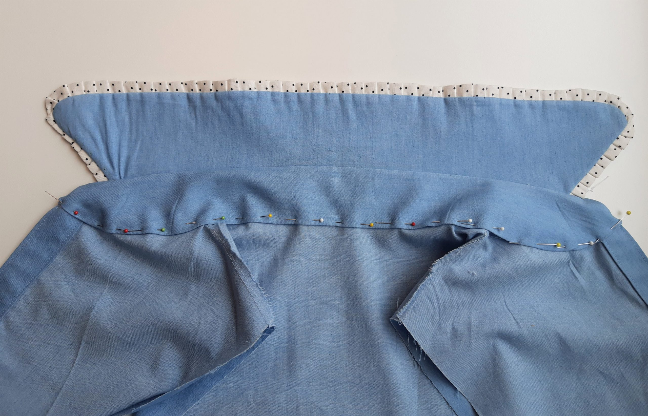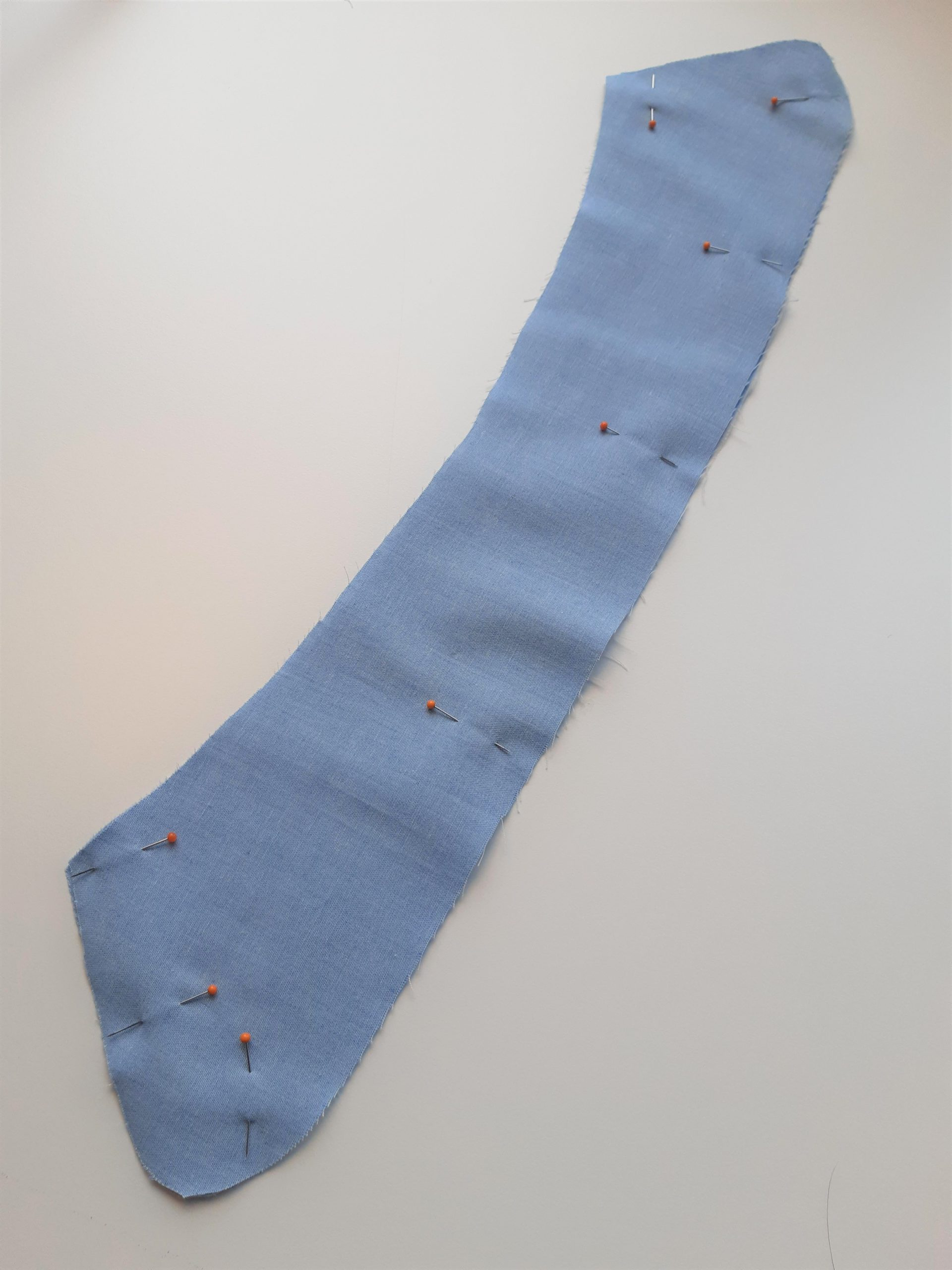 4. Fixiere die Kante mit Stecknadeln am Halsausschnitt und an der Saumkante.