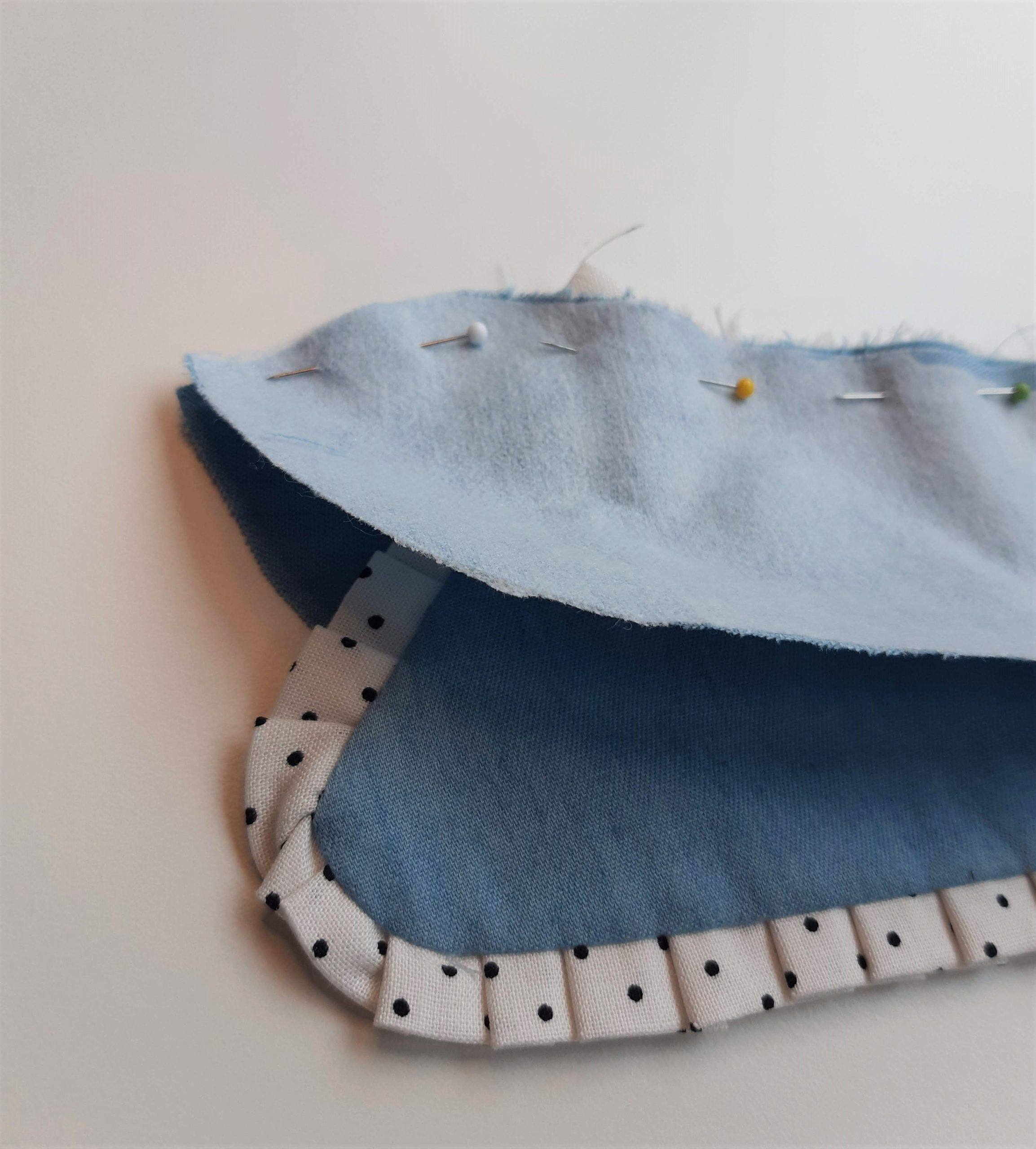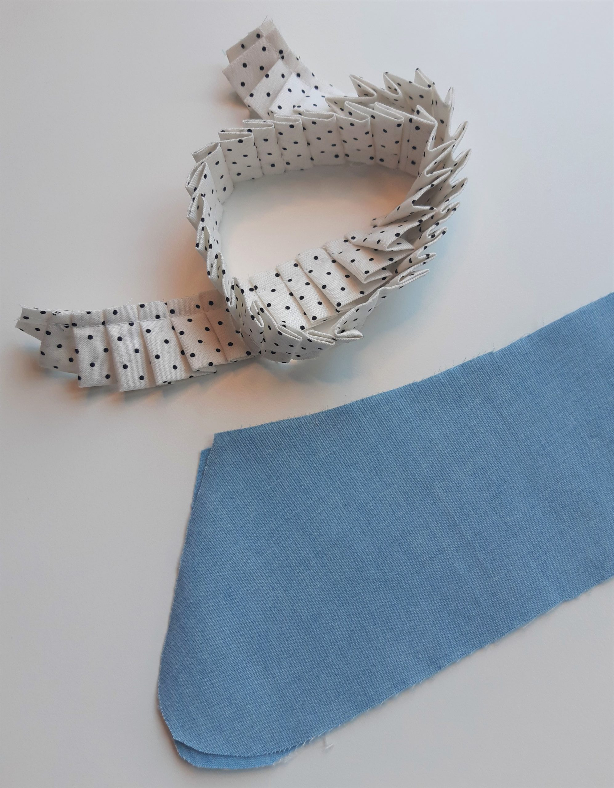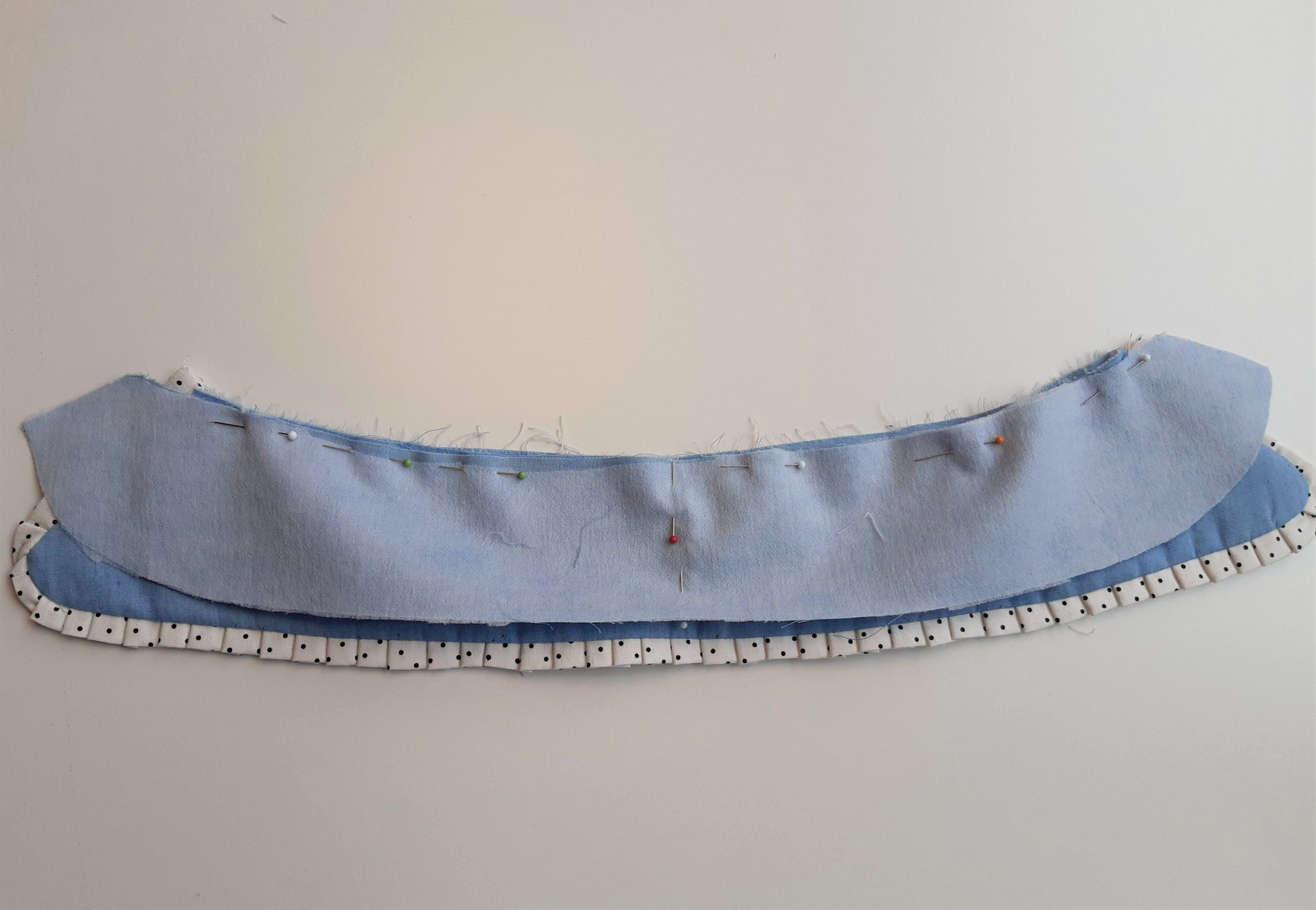 5. Lege das fertige Faltenband zwischen beide Kragenschnittteile, fixiere die 3 Stofflagen mit Stecknadeln und verfahre weiter wie in Schritt 6 beschrieben.