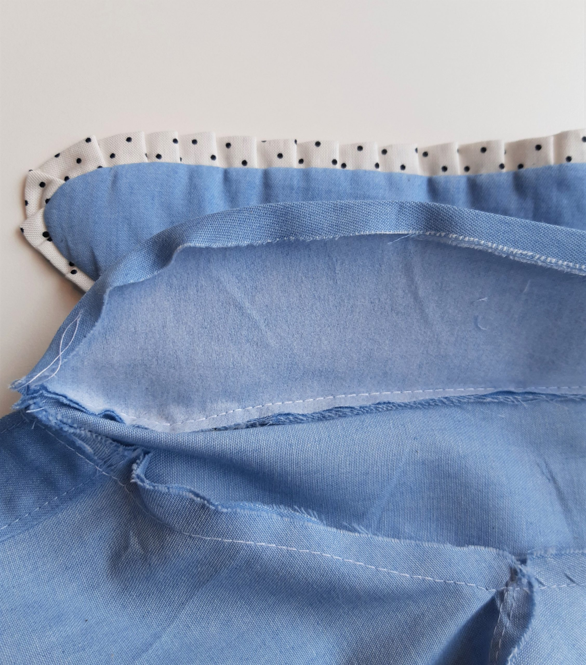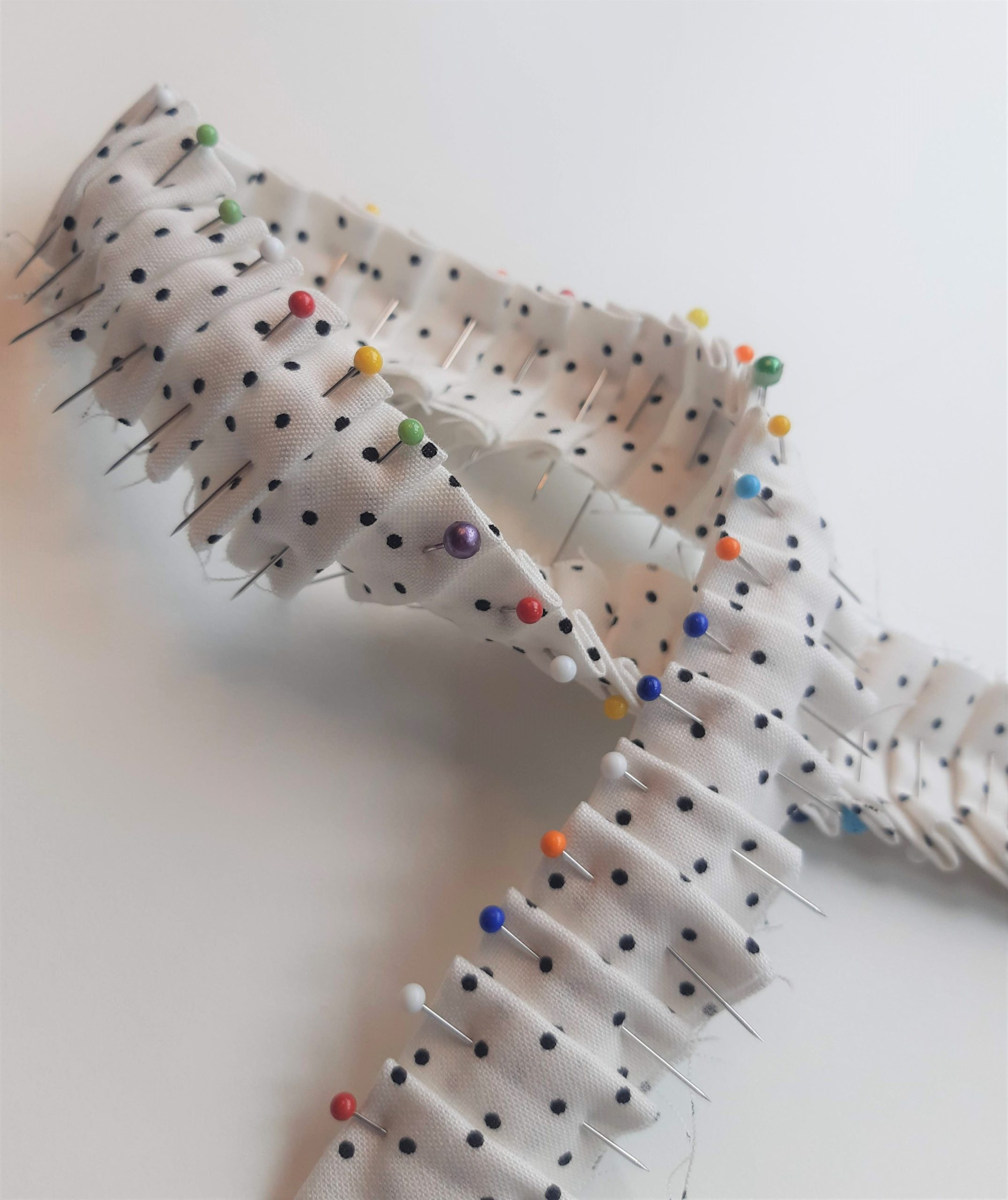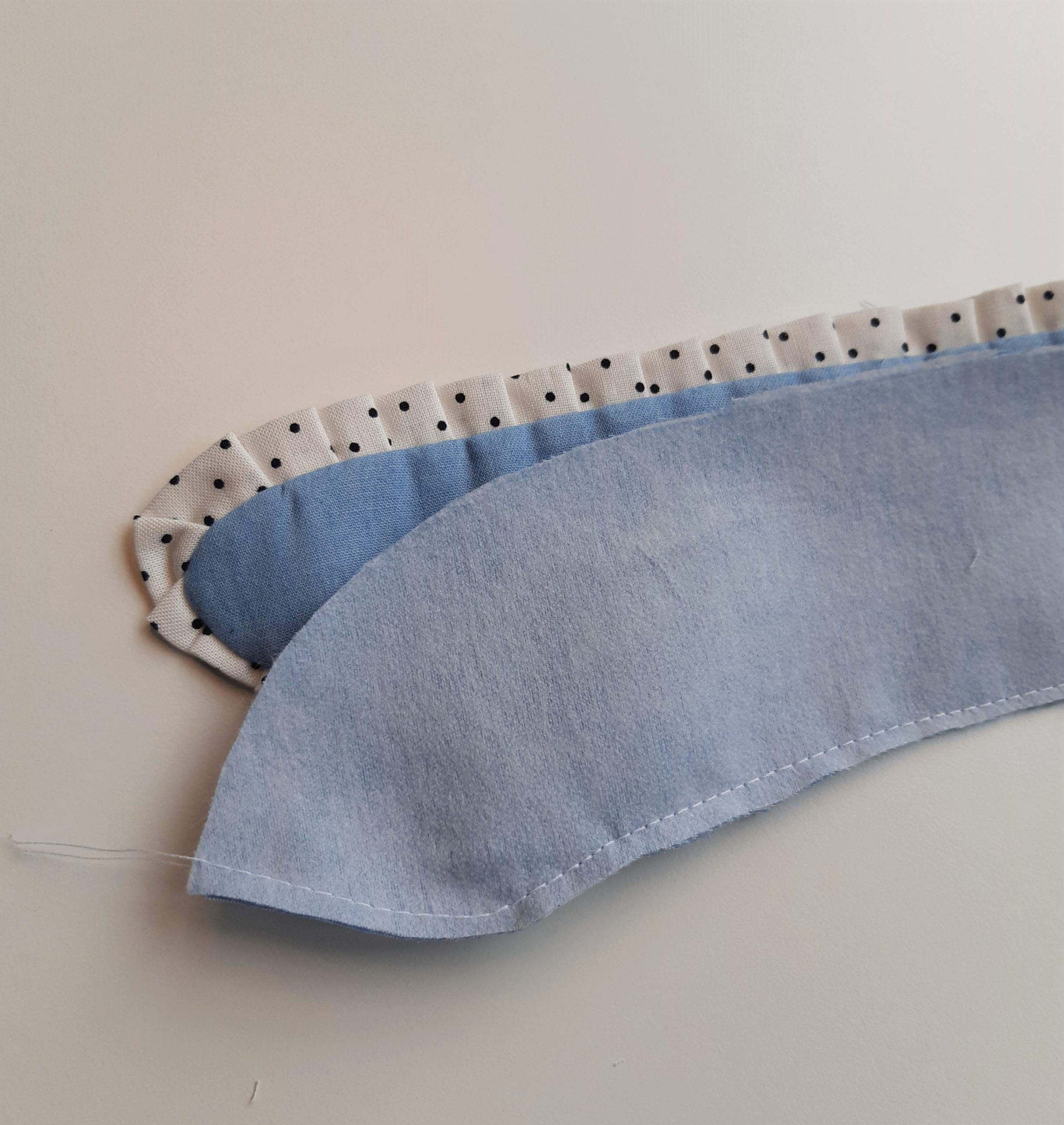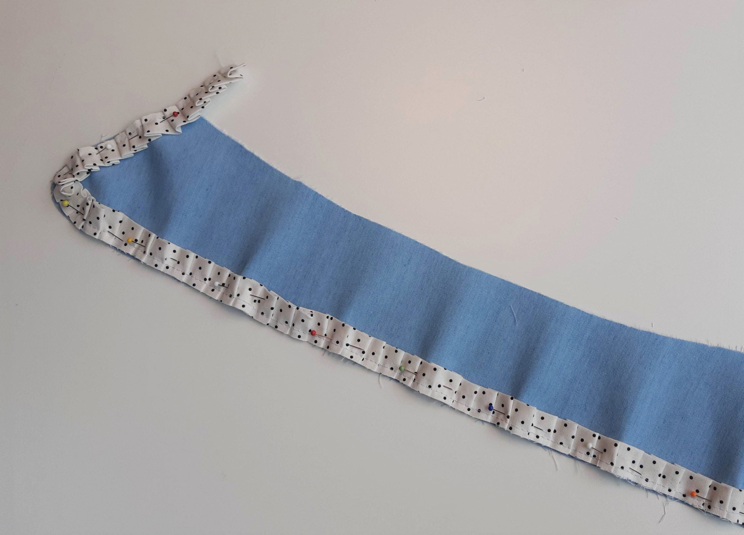 5. Lege das fertige Faltenband zwischen beide Kragenschnittteile, fixiere die 3 Stofflagen mit Stecknadeln und verfahre weiter wie in Schritt 6 beschrieben.