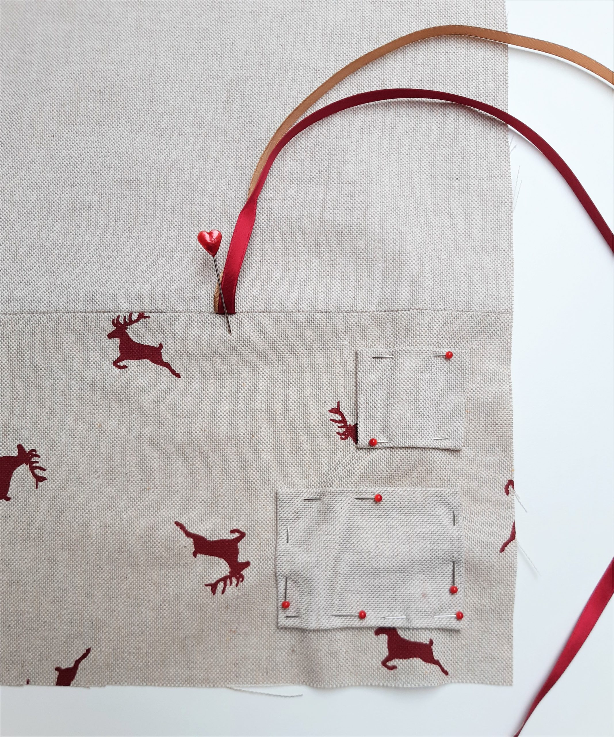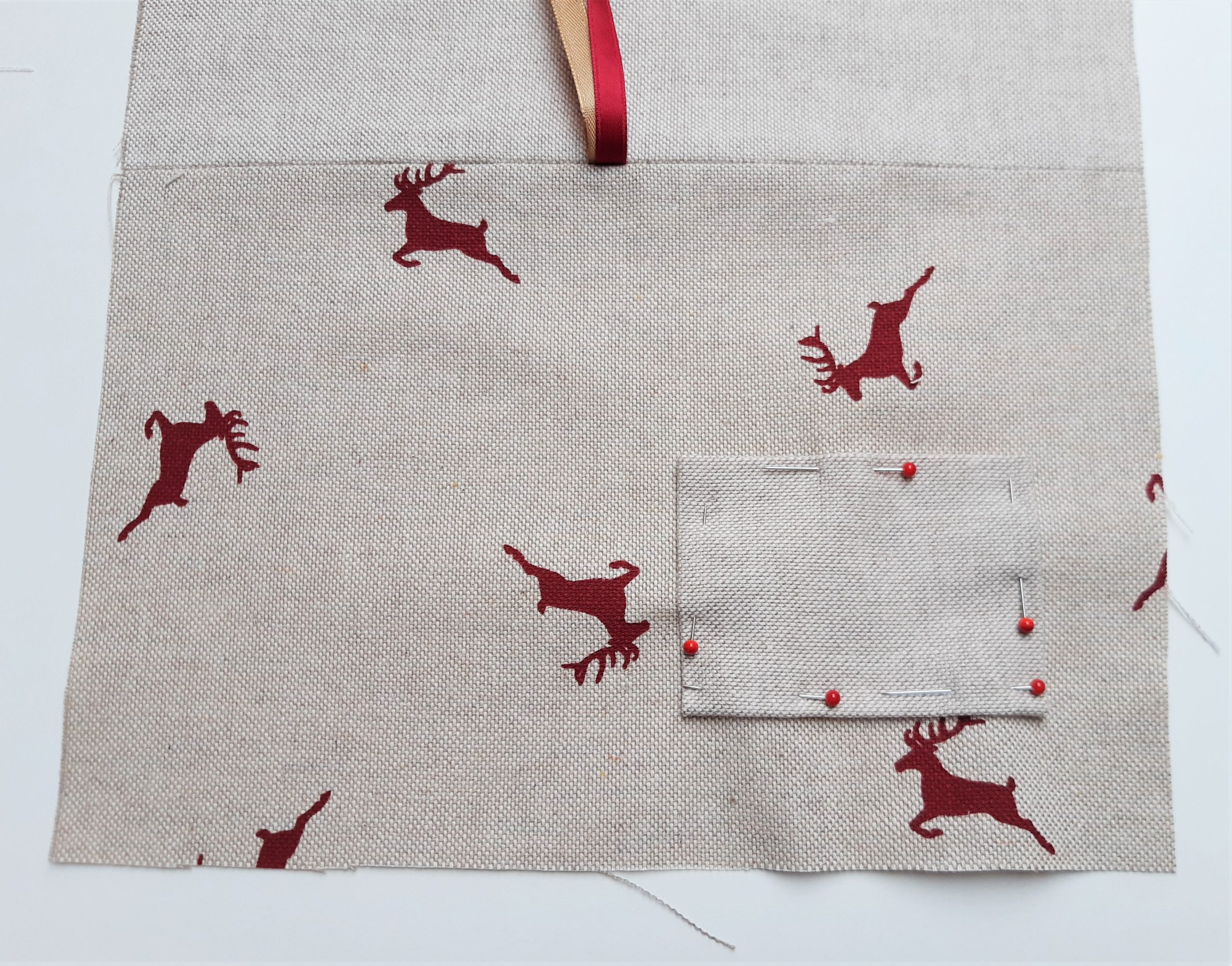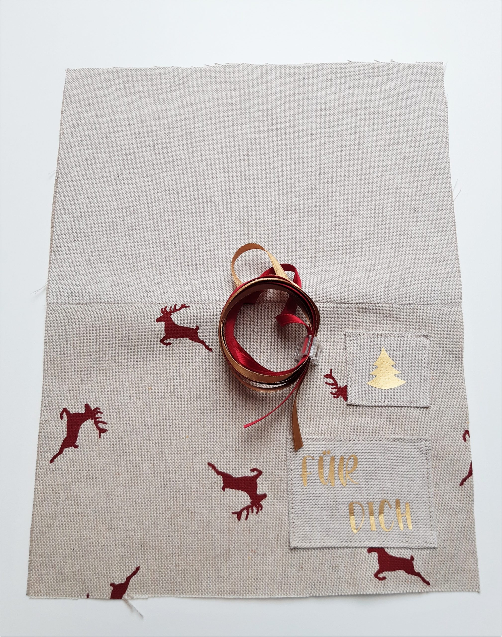 1. Die Schleifenbänder mittig an ein Außenstoffschnittteil stecken.