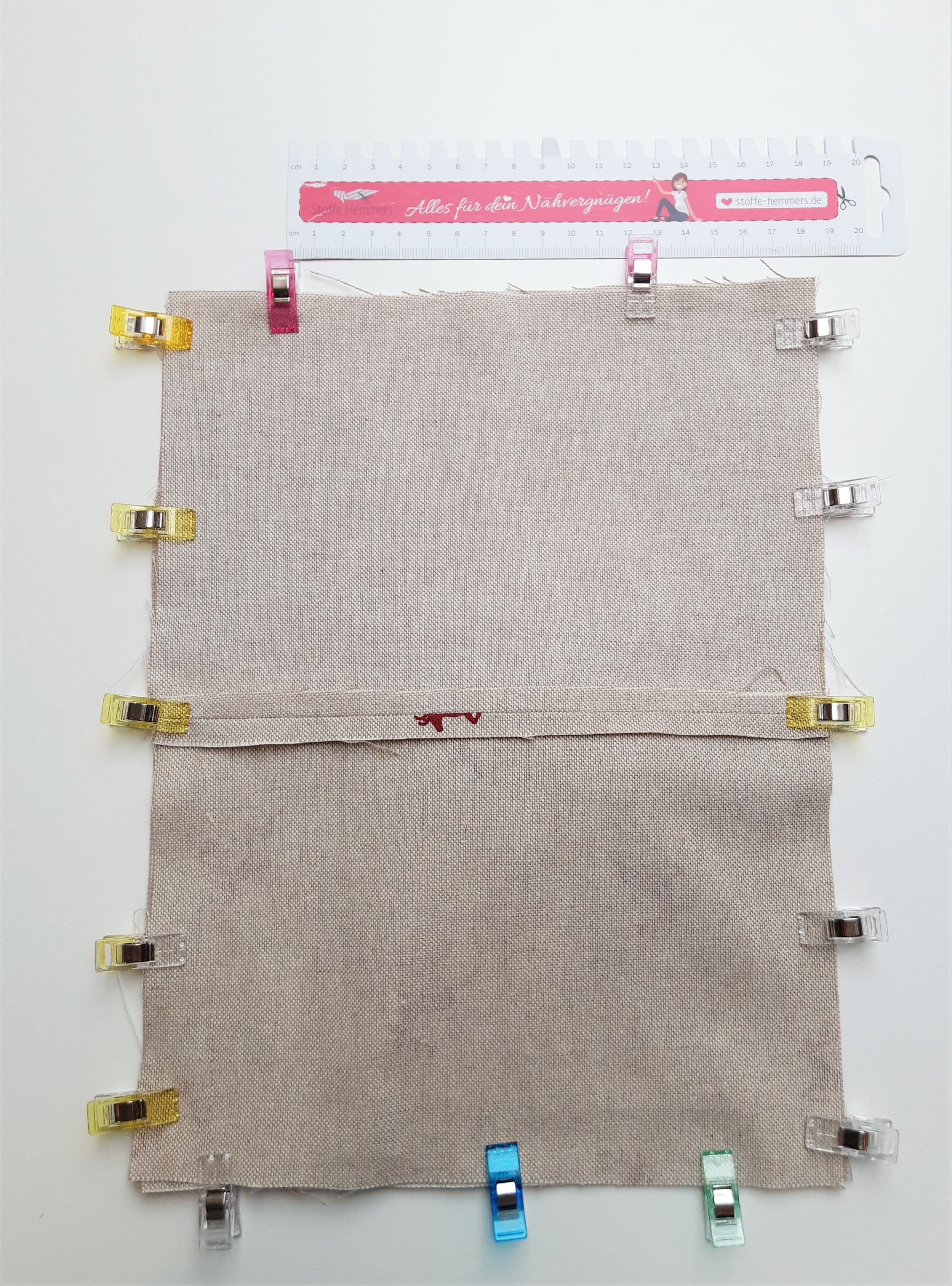 4. Stecke ringsherum alle Kanten mit Stecknadeln oder Klammern fest. Achte auf eine ca. 10 cm Wendeöffnung » Innenstoff
