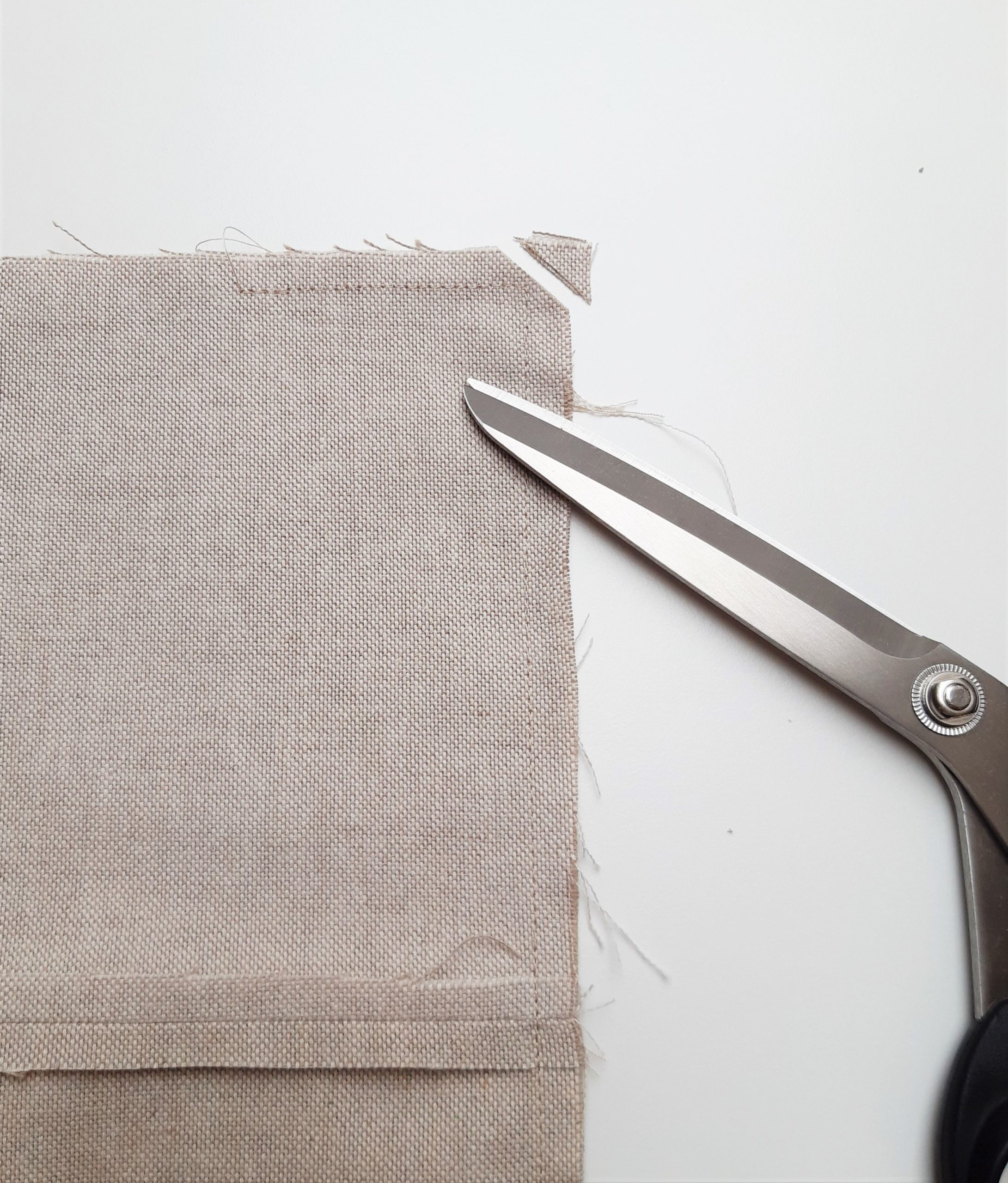 5. Nähe alle Kanten zusammen und kürze im Anschluss die Nahtzugaben, schneide die Spitzen schräg ab.