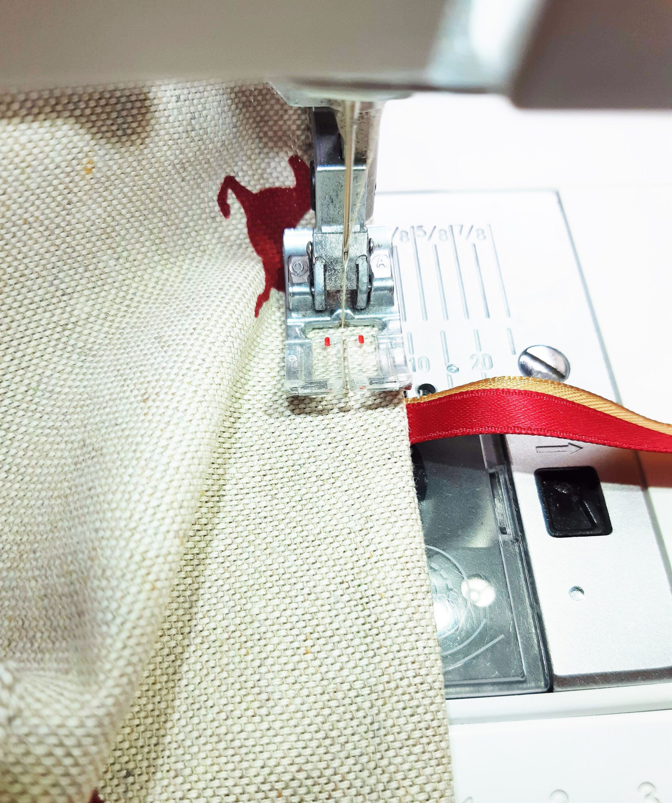 Beachte: Beim Nähen wird das Schleifenband nicht mit in die Naht eingefasst.