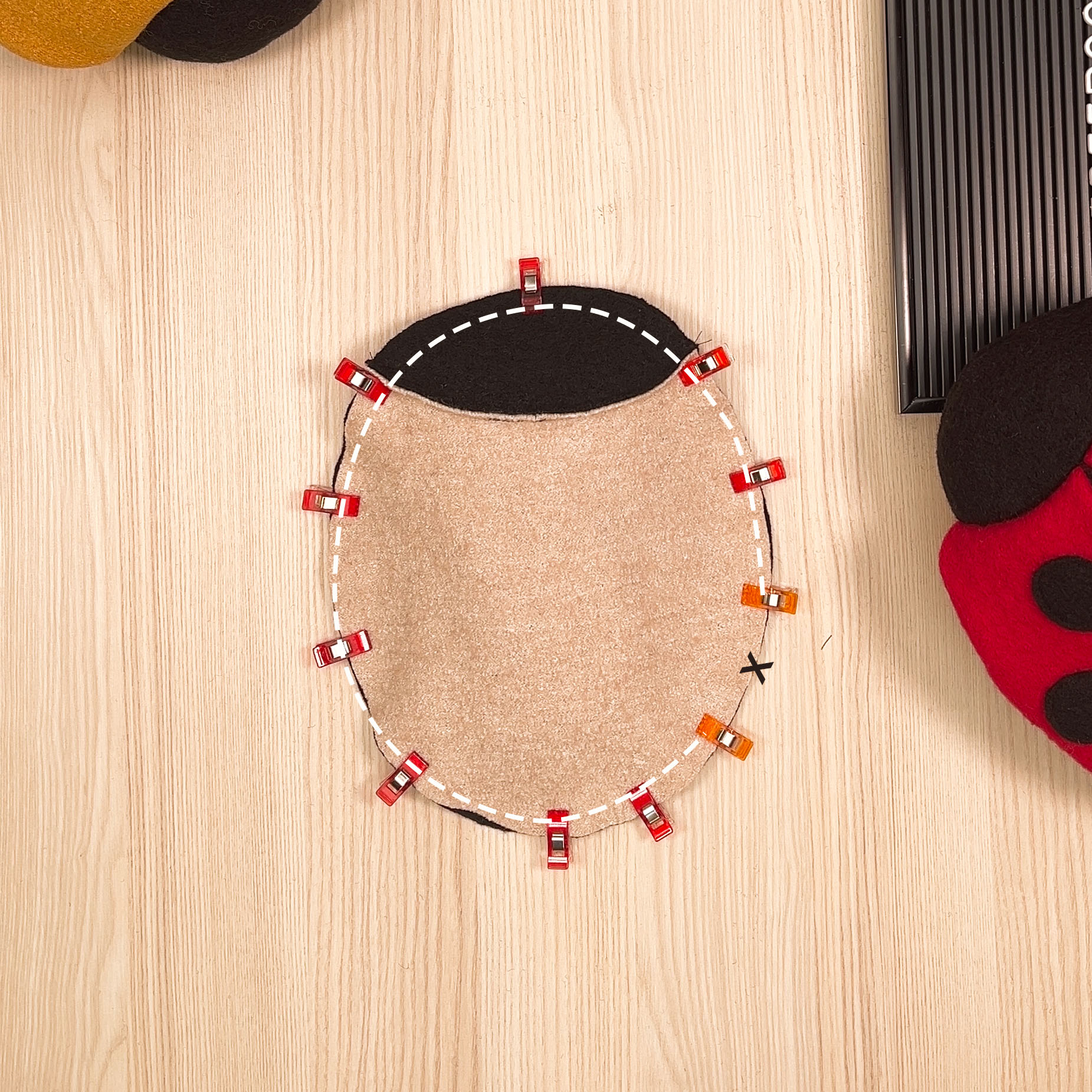 1. Lege nun die beiden Flügel auf den Zuschnitt des schwarzen Körpers und stecke sie von der Mitte ausgehend fest,