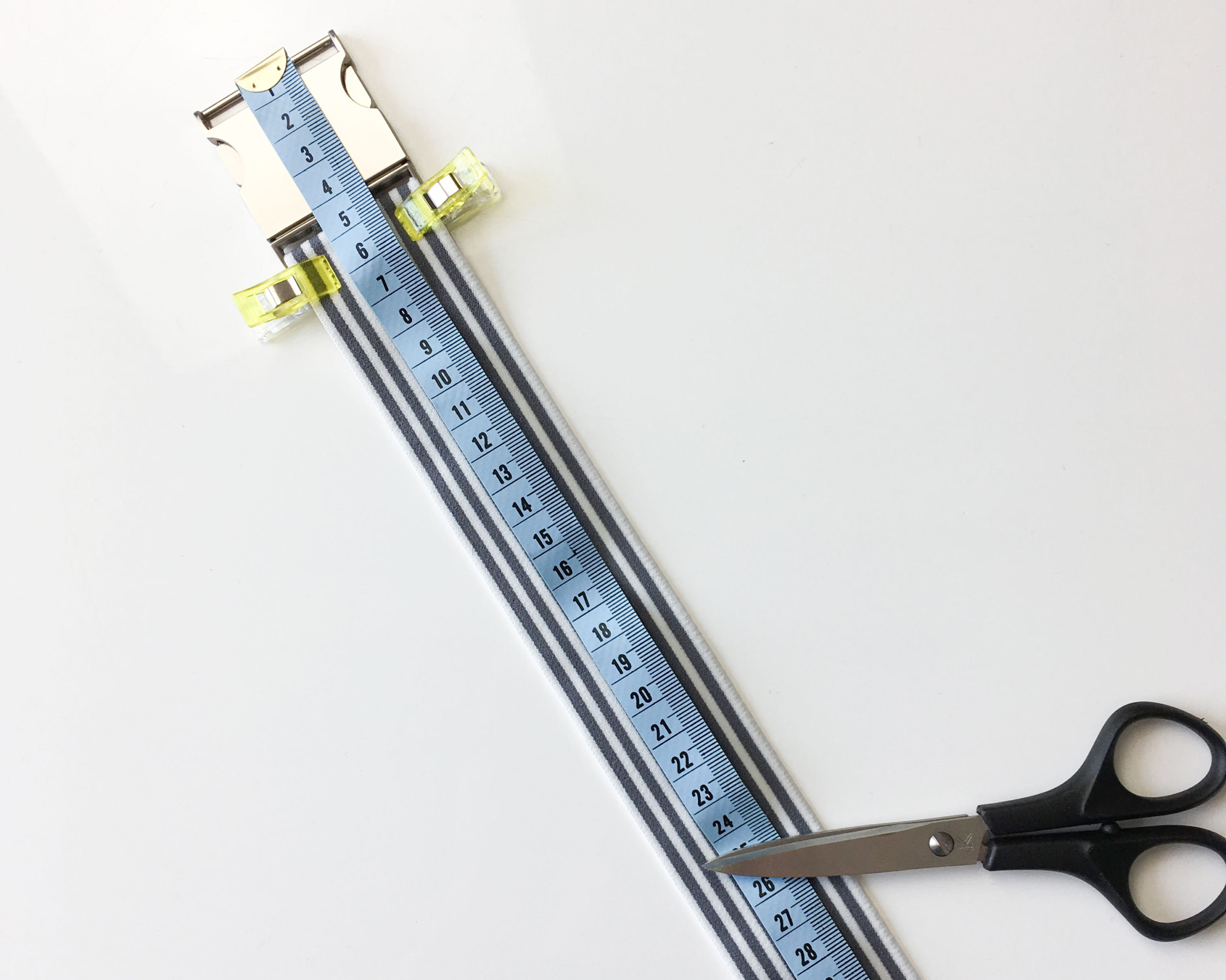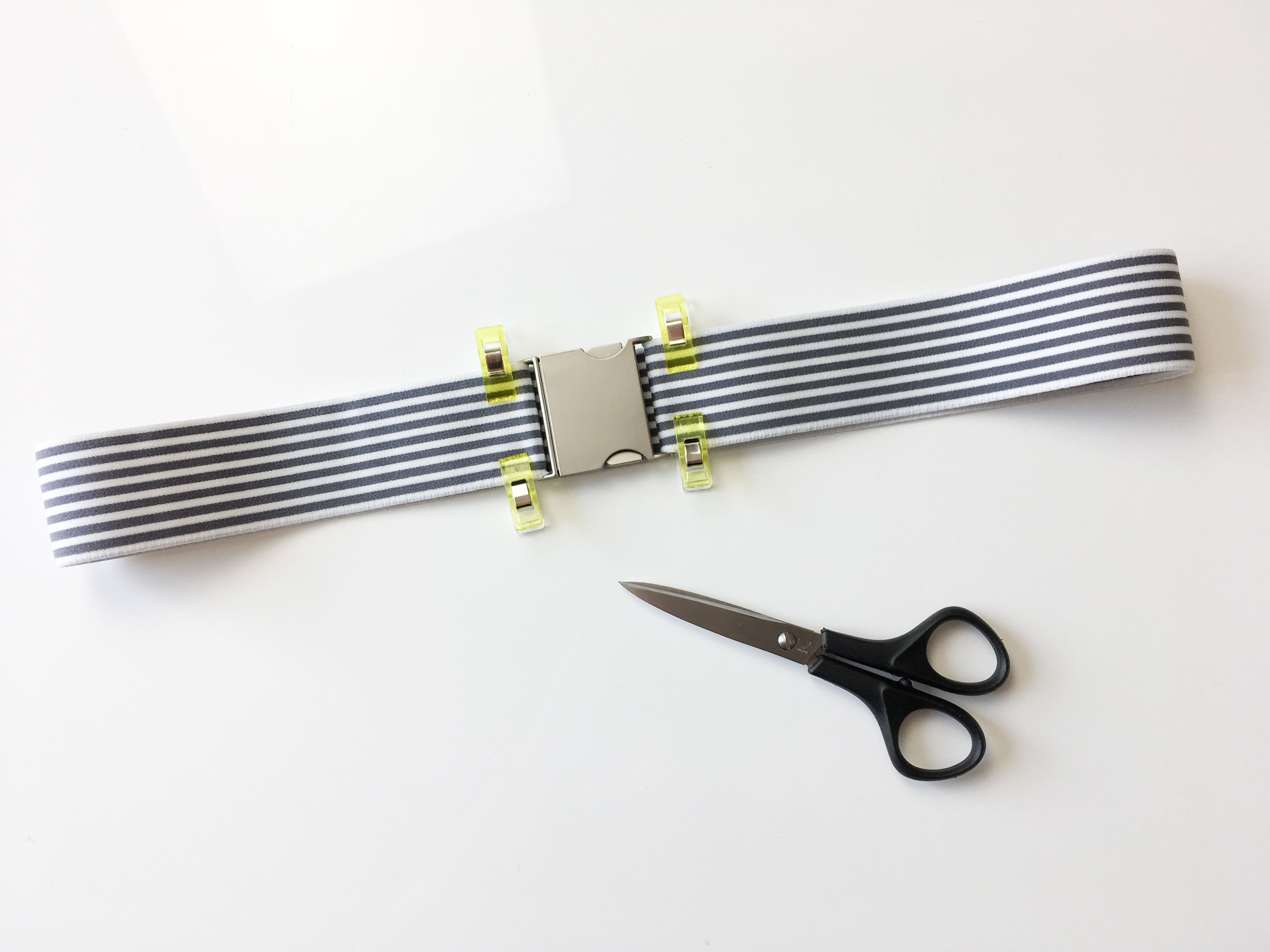 Gummiband an beiden Seiten in den Verschluss ziehen und etwa 1-2 cm umgeklappt feststecken oder klammern.