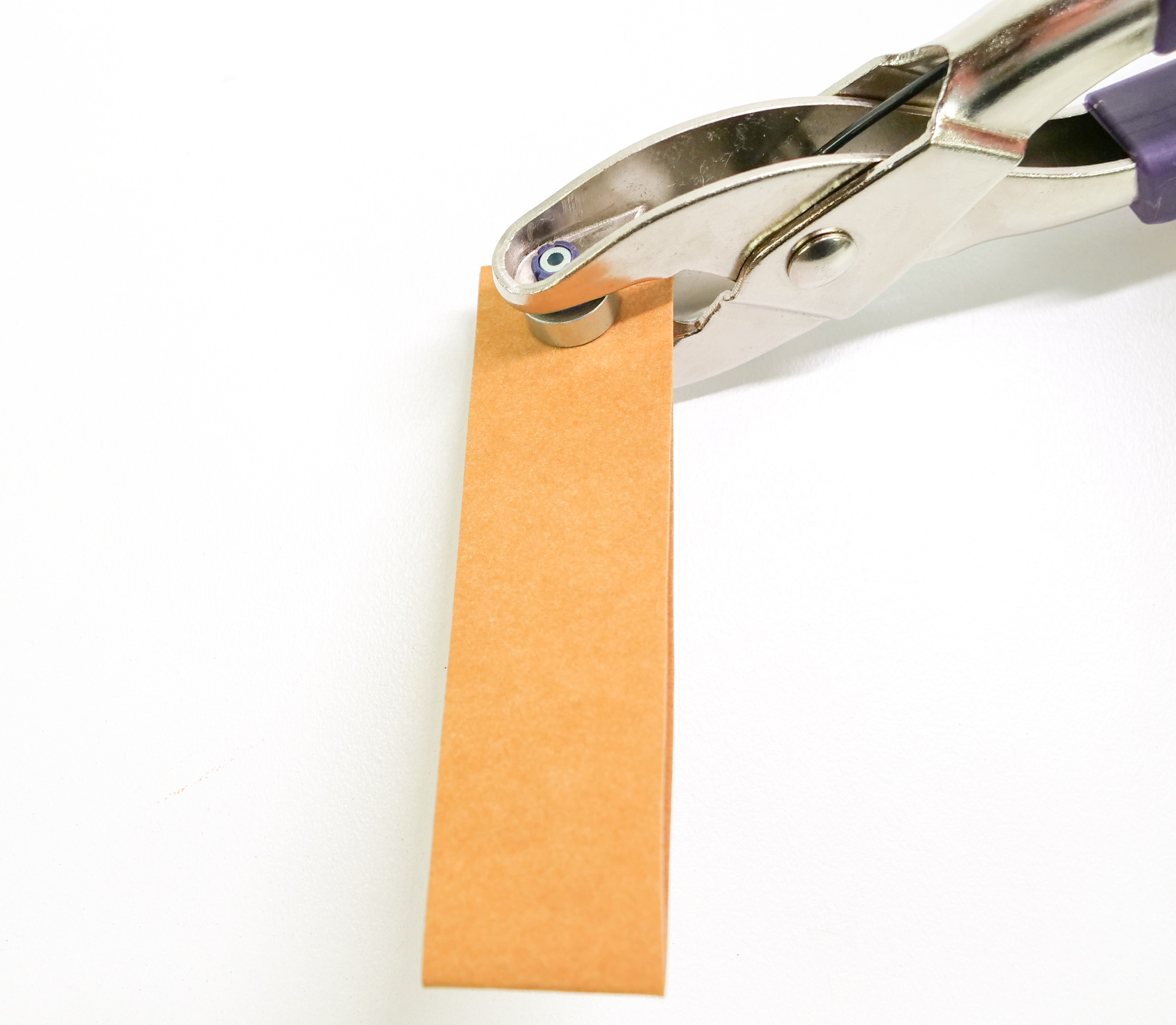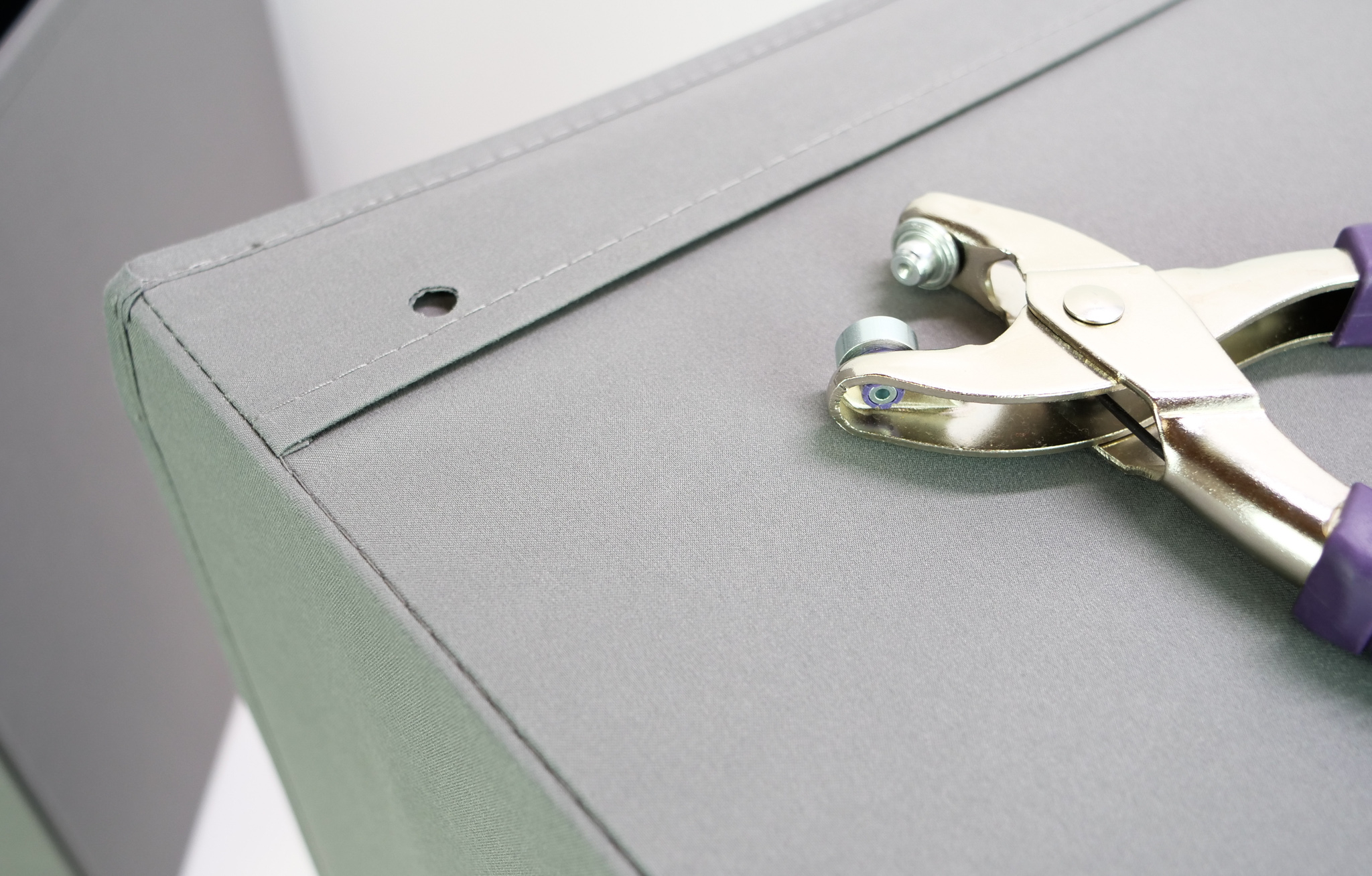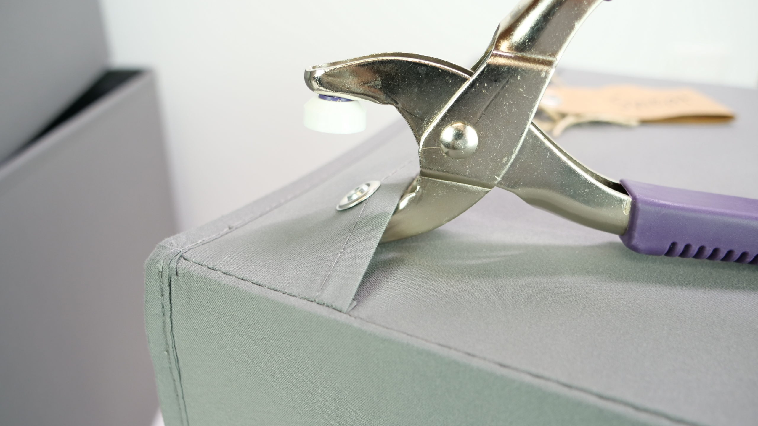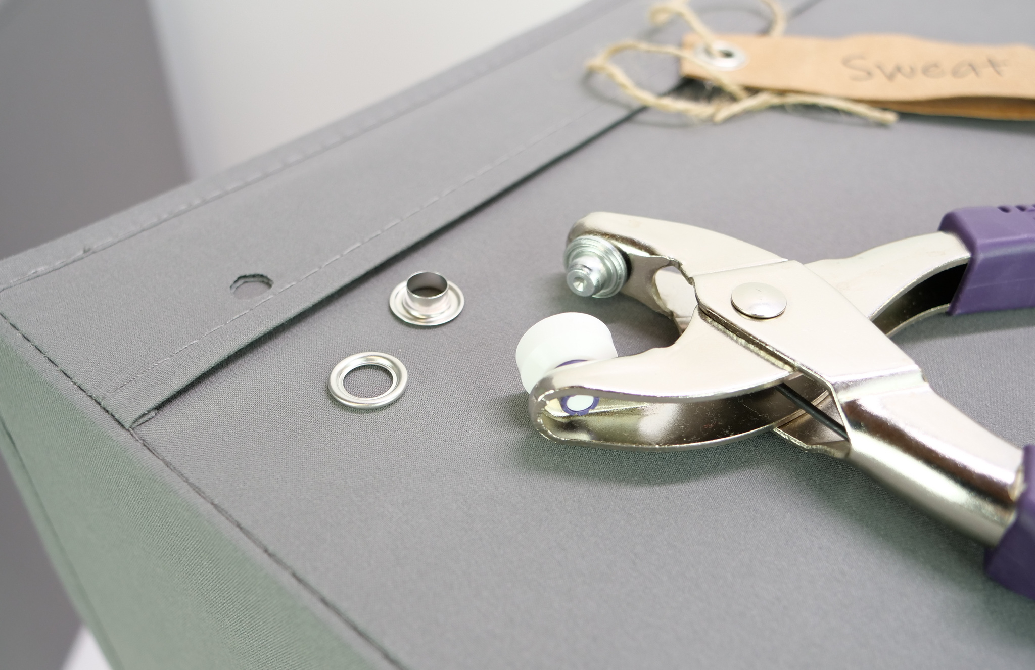 1. Zum Schluss bringst du noch eine Öse an den Stoffgriff der Kiste an.