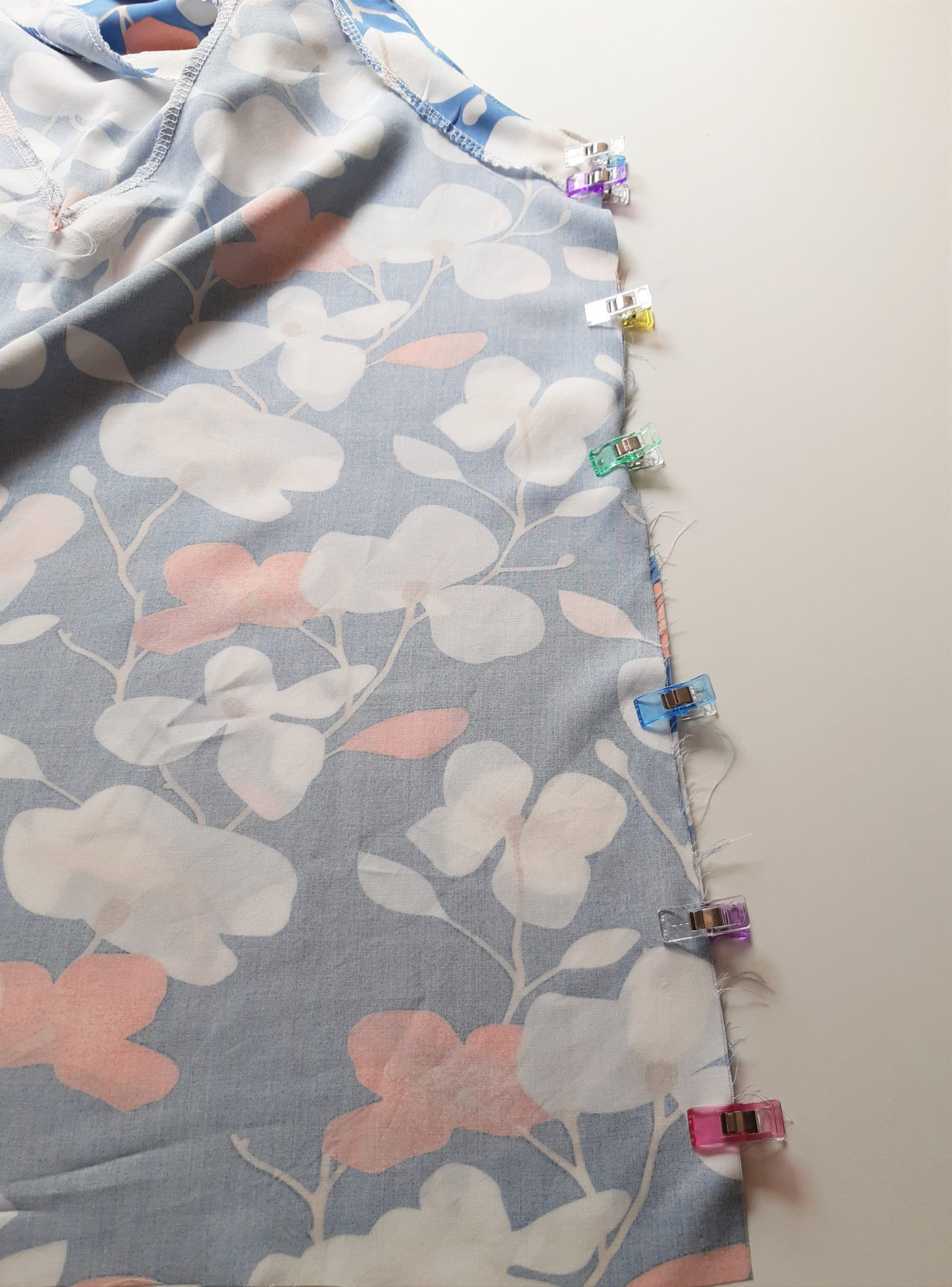 1. Lege das fast fertige Top rechts auf rechts und stecke die Seitenkanten mit Stecknadeln oder Clipsen zusammen.