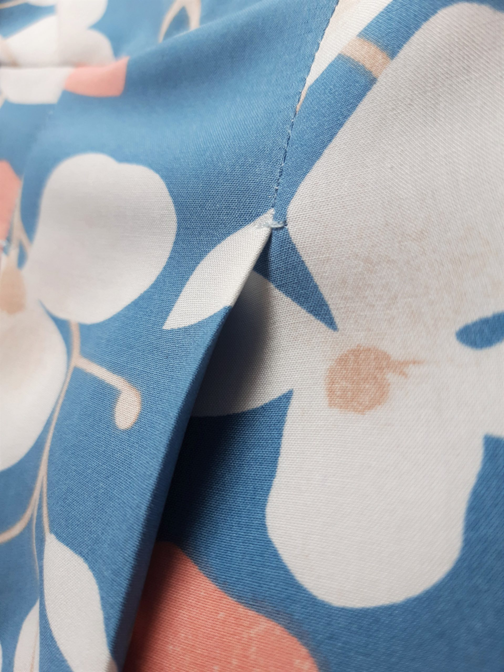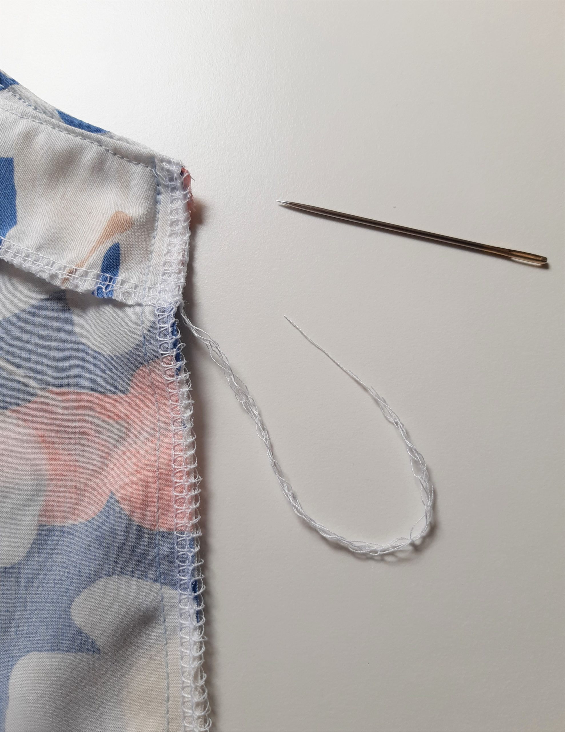 Zum Schluss werden die Belege noch zusammen auf Höhe der Schulter unterhalb des Volants mit ein paar Stichen fixiert.