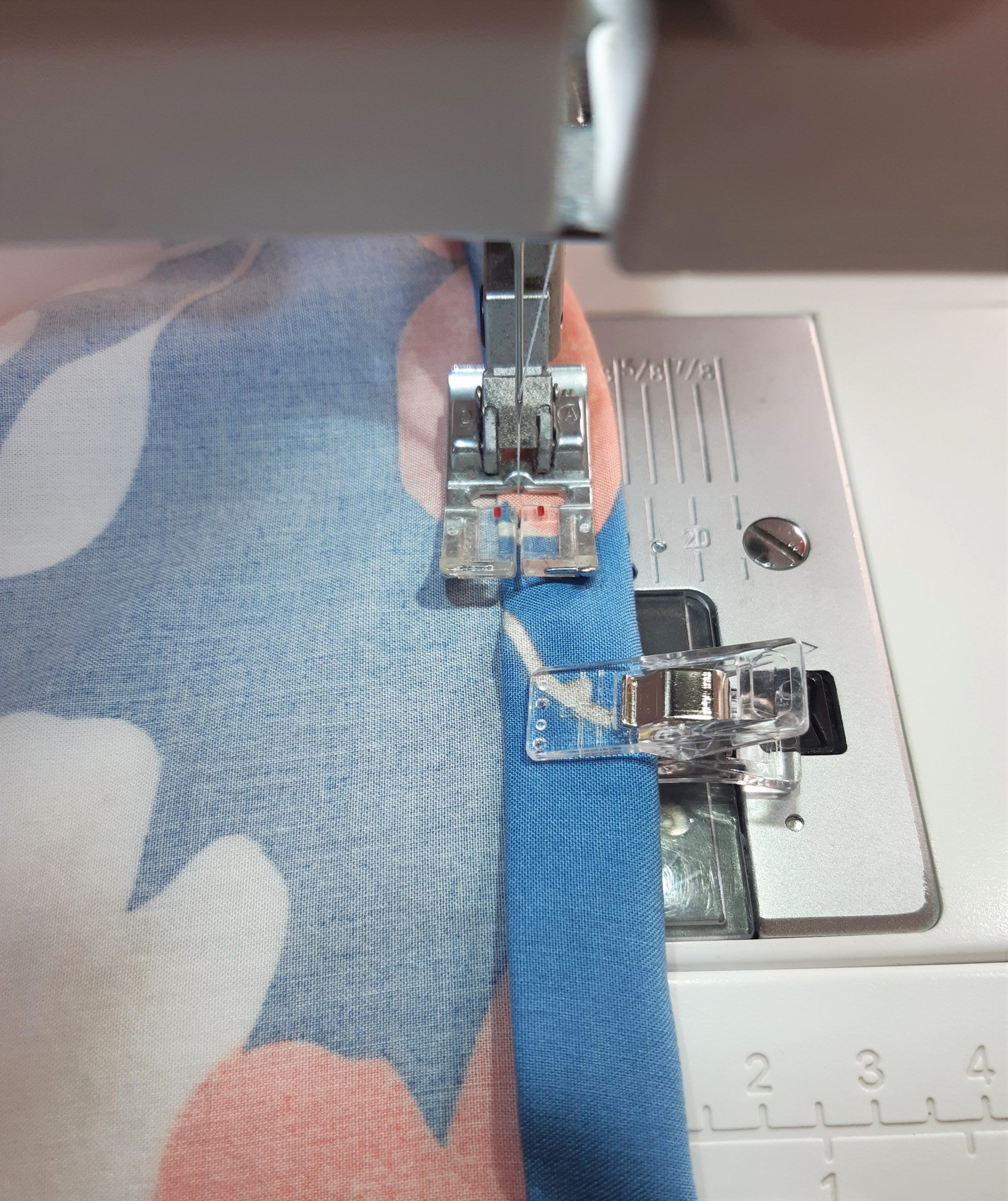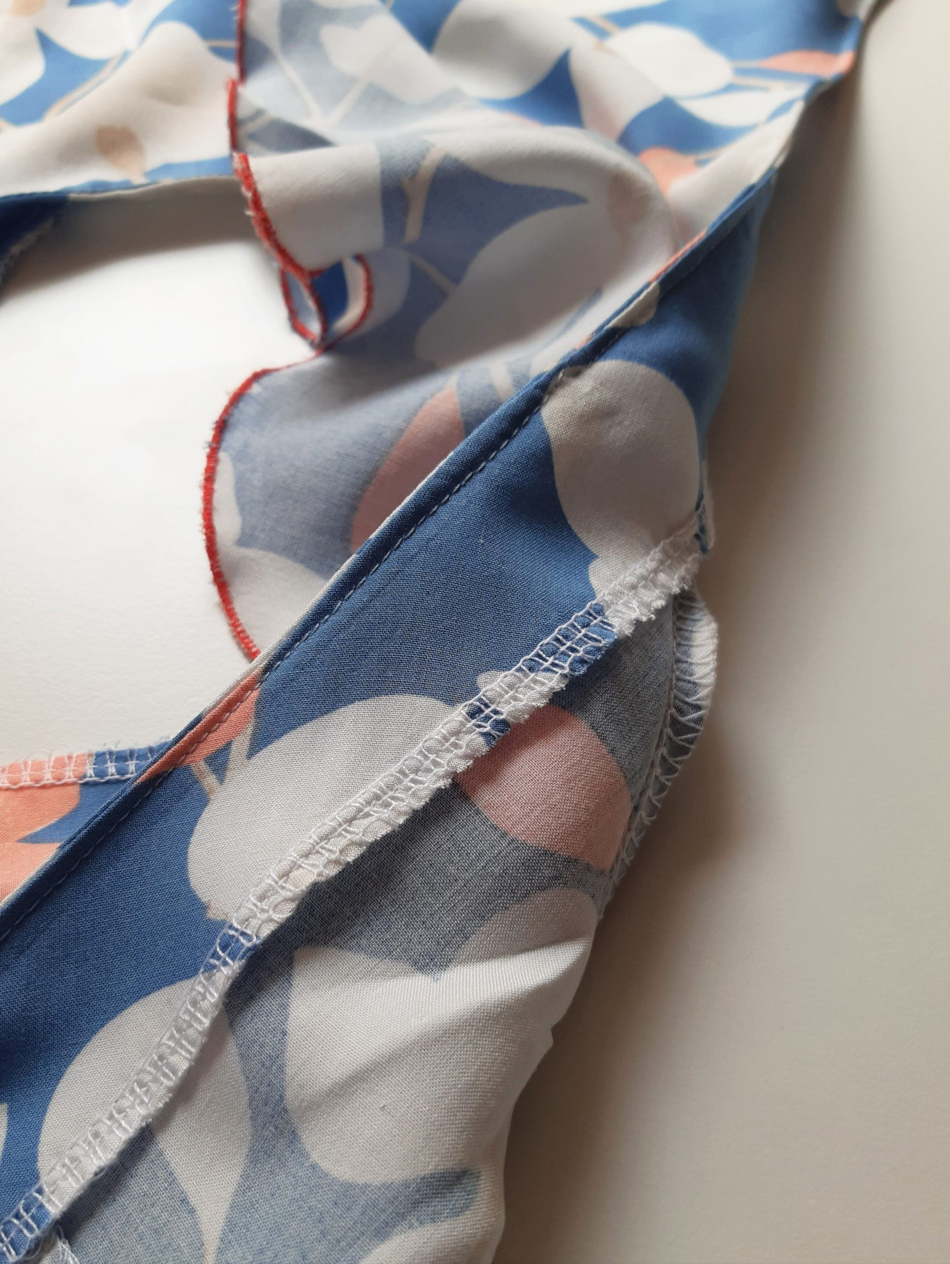 Ich nutze hierzu einen sehr schmalen Zickzackstich meiner Nähmaschine, du kannst den Rollsaum aber auch mit einer Overlock nähen.