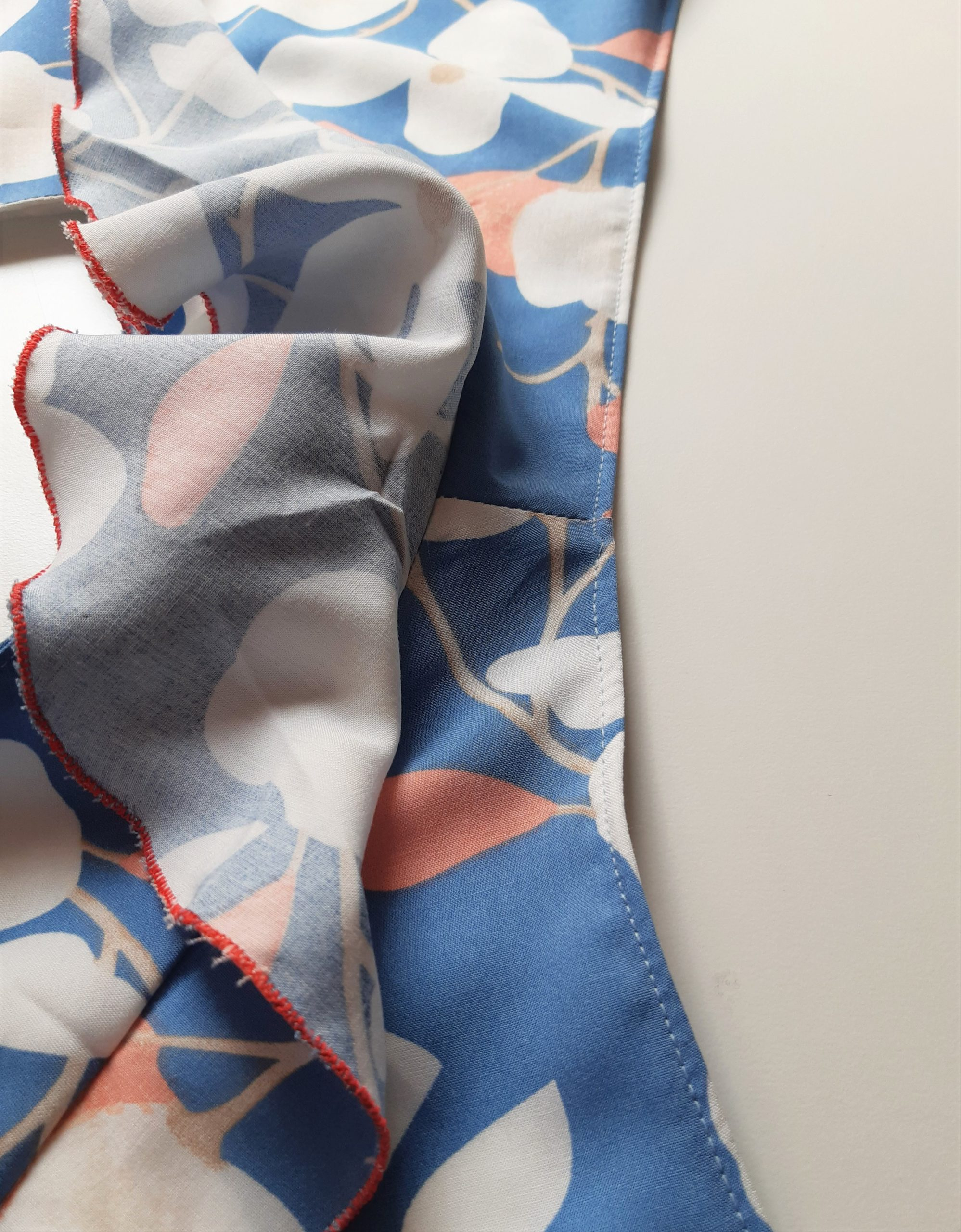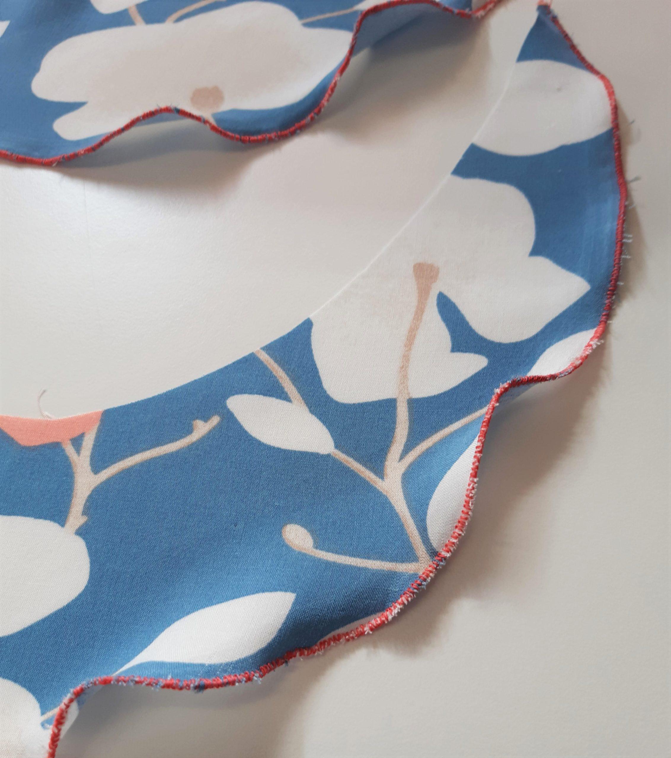 Nimm dir deine Volantschnittteile zur Hand und versäubere die Außenkanten mit einem Rollsaum.