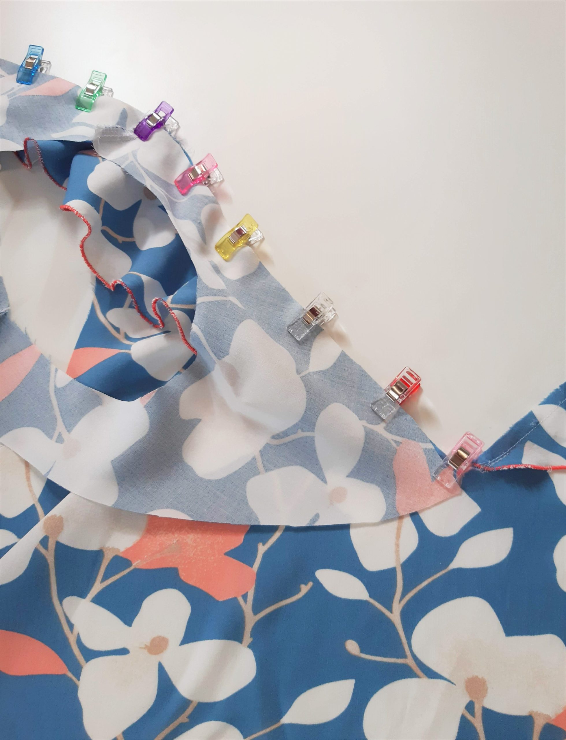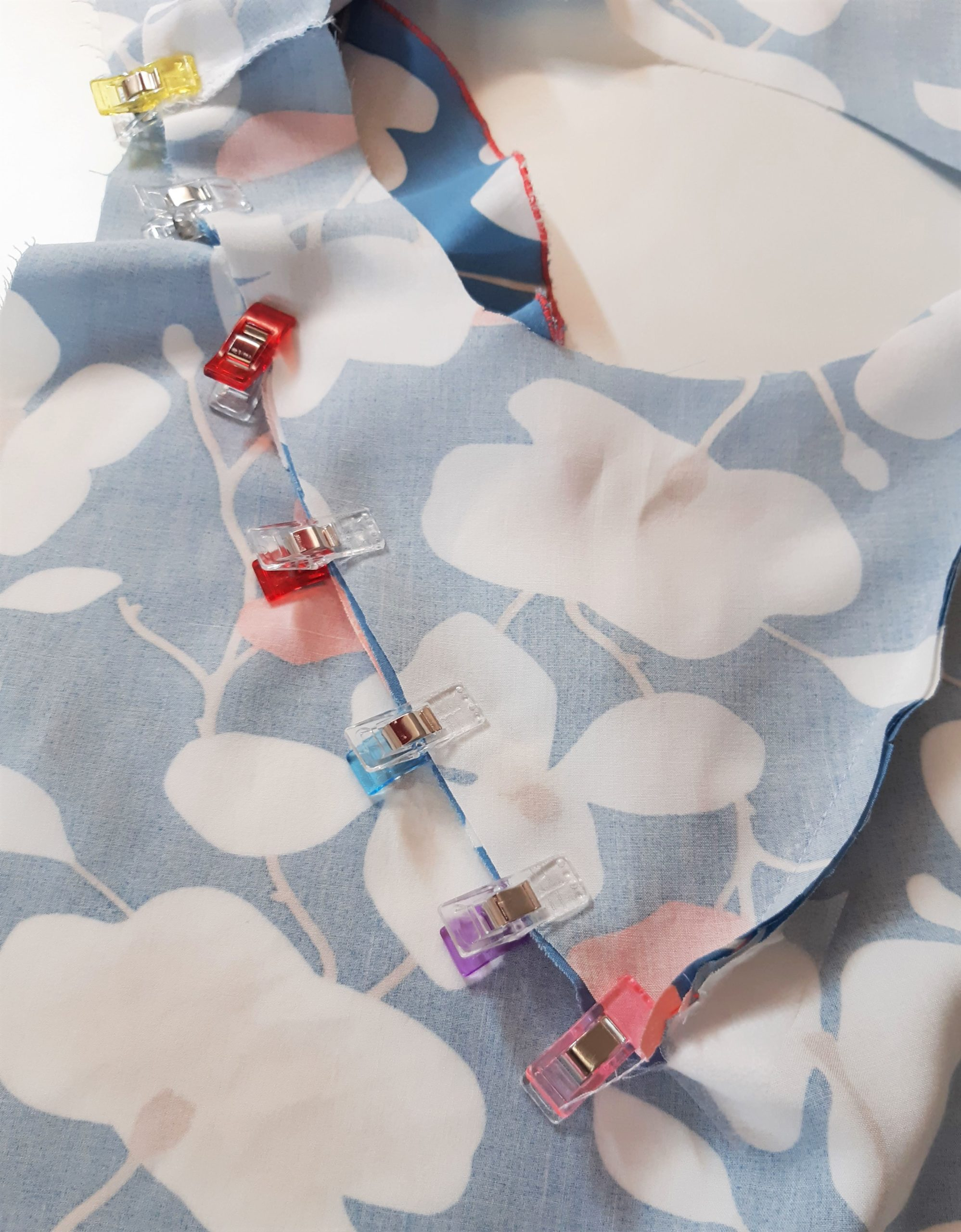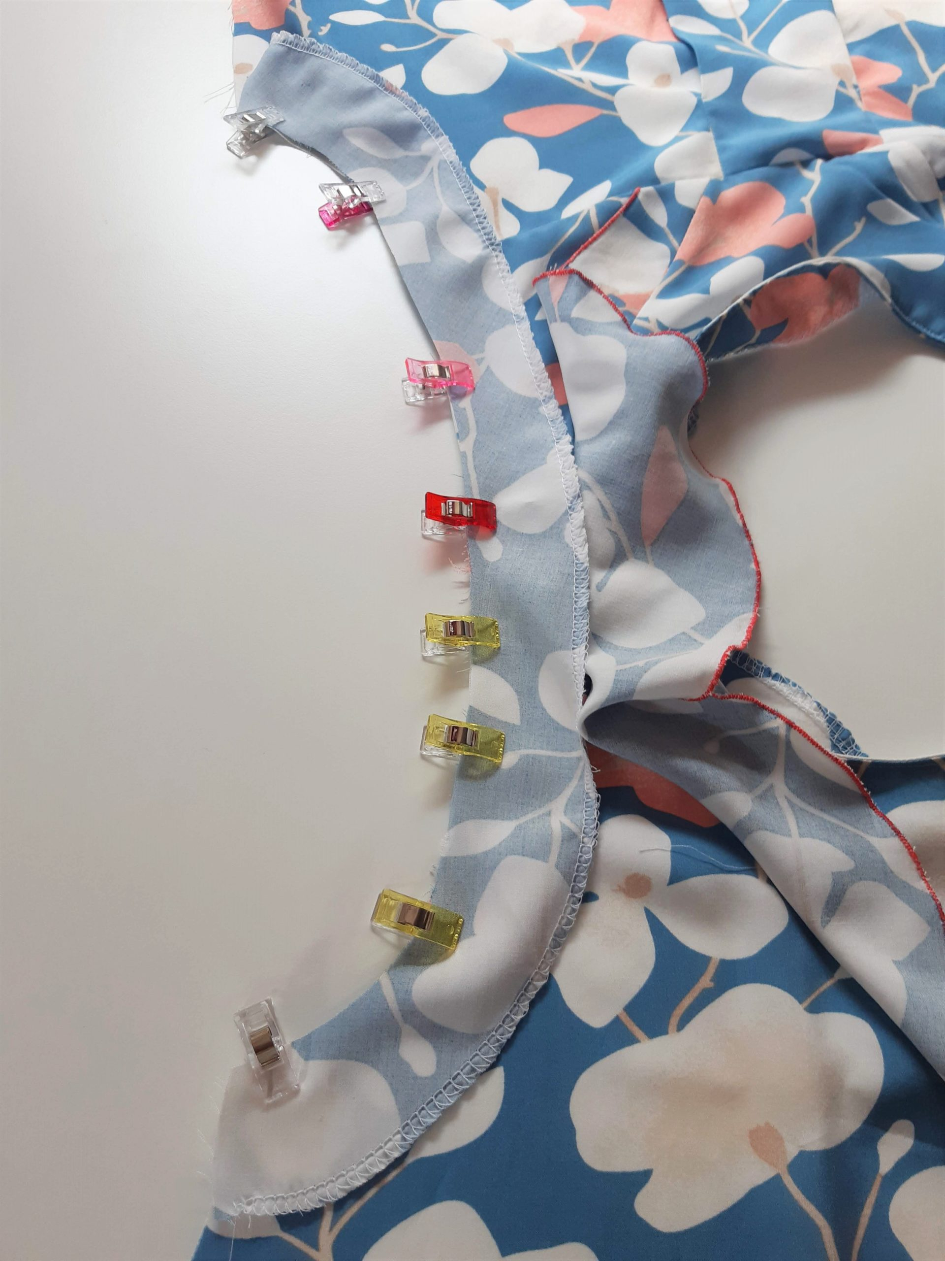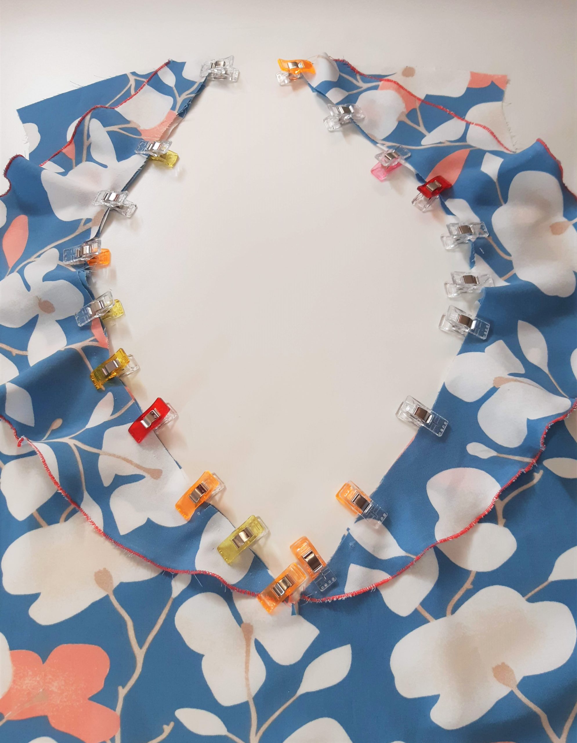 Lege die Volants mit der linken Stoffseite an deinen Ausschnitt und stecke sie mit Stecknadeln oder Clipsen fest.