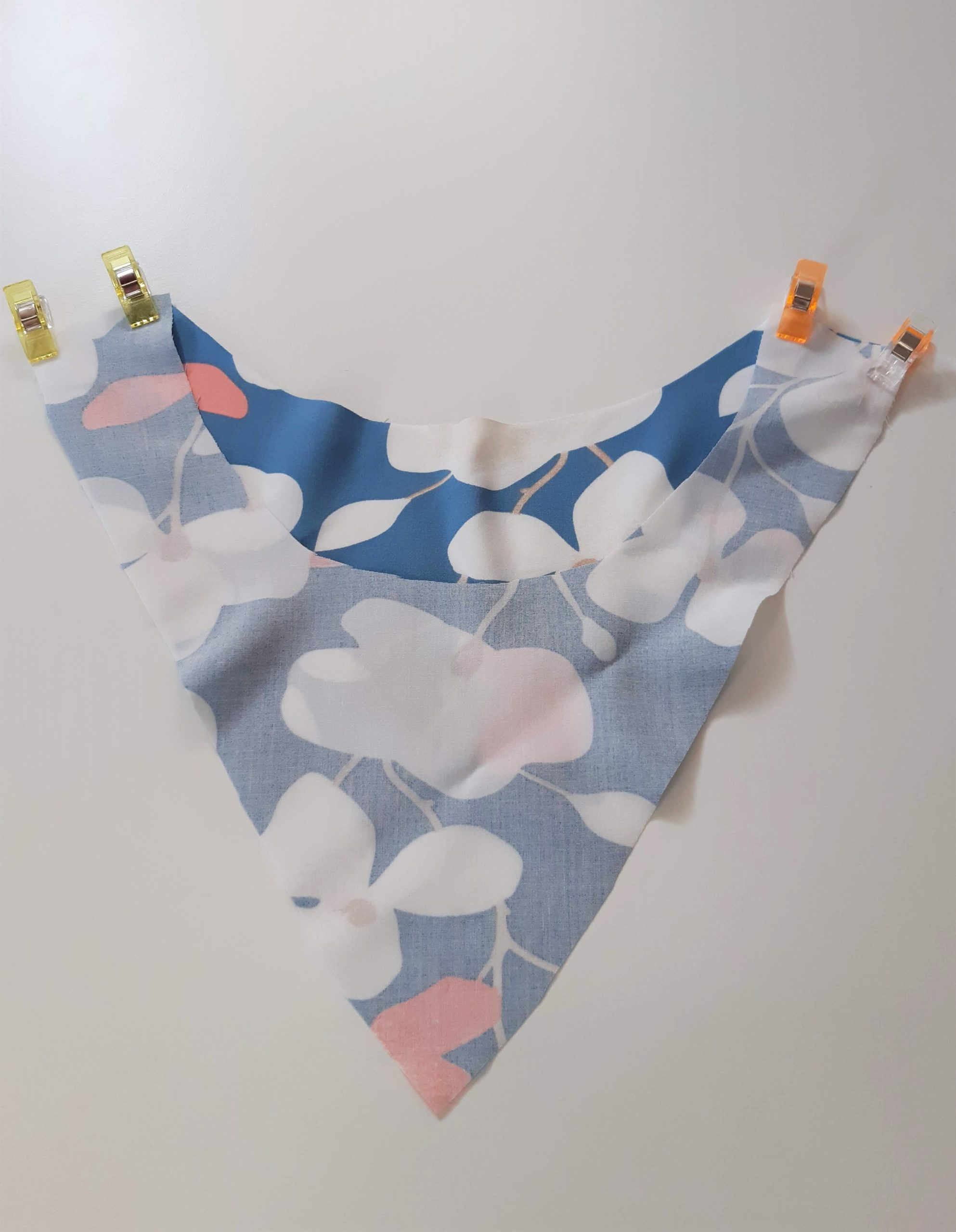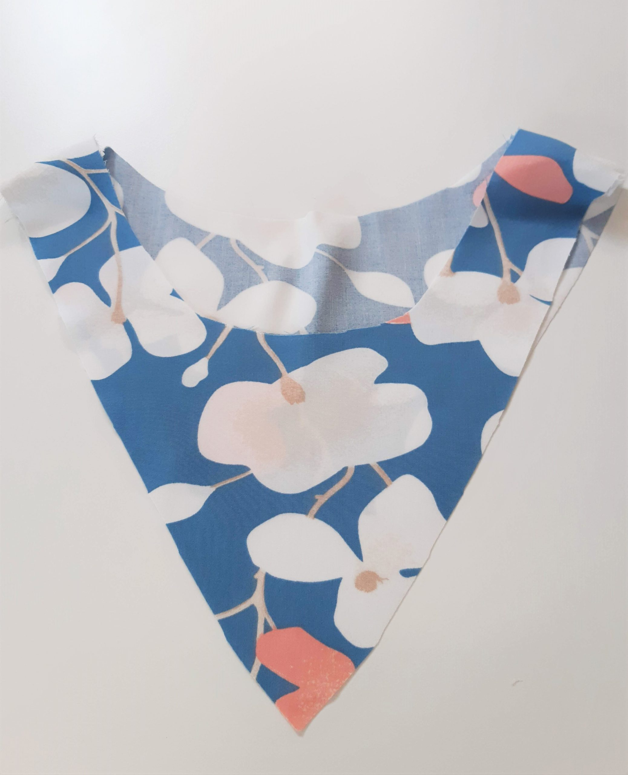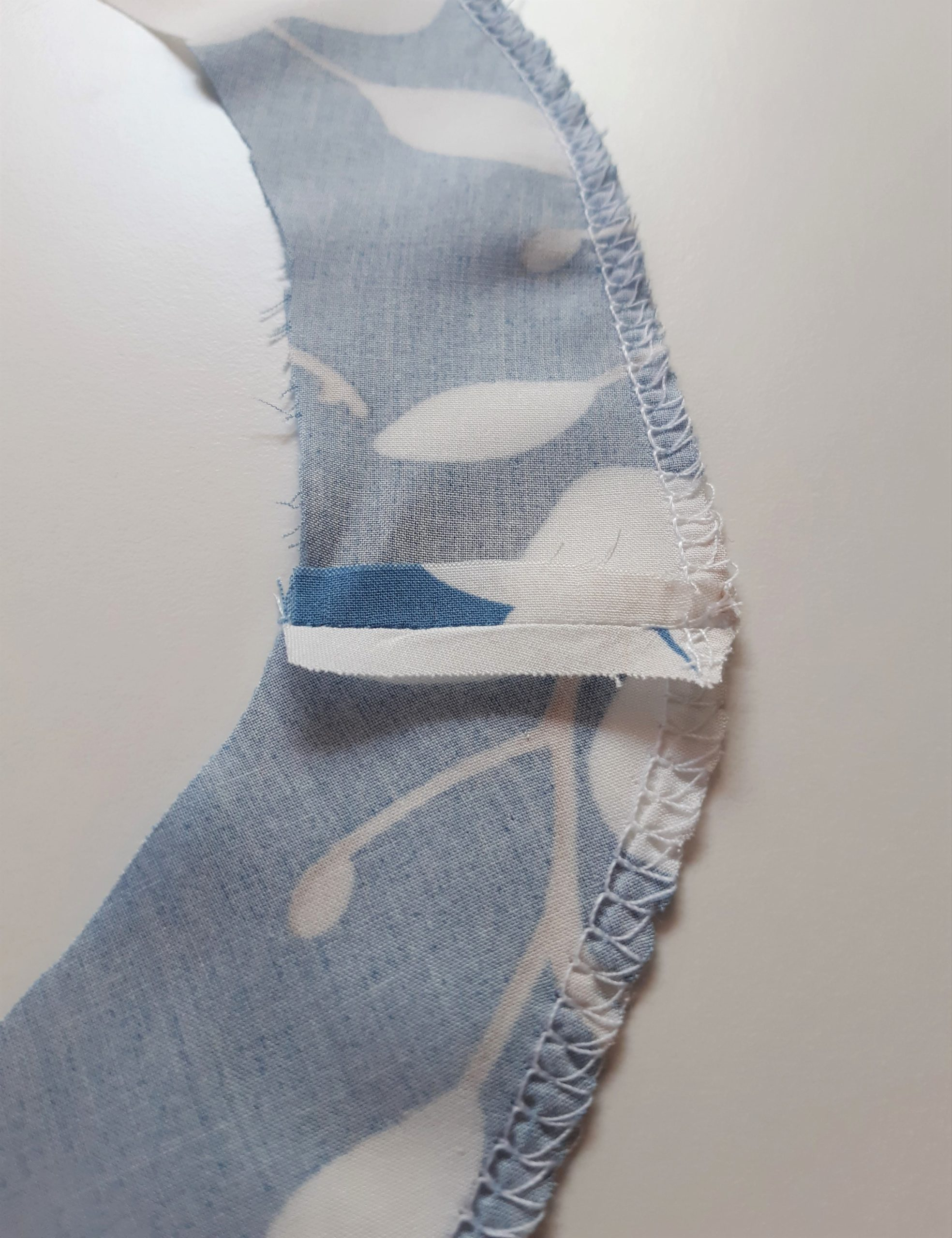 4. Lege den Beleg nun rechts auf rechts an den Halsausschnitt und nähe ihn an. Anschließend werden die Nahtzugaben bis kurz vor der Naht eingeschnitten.