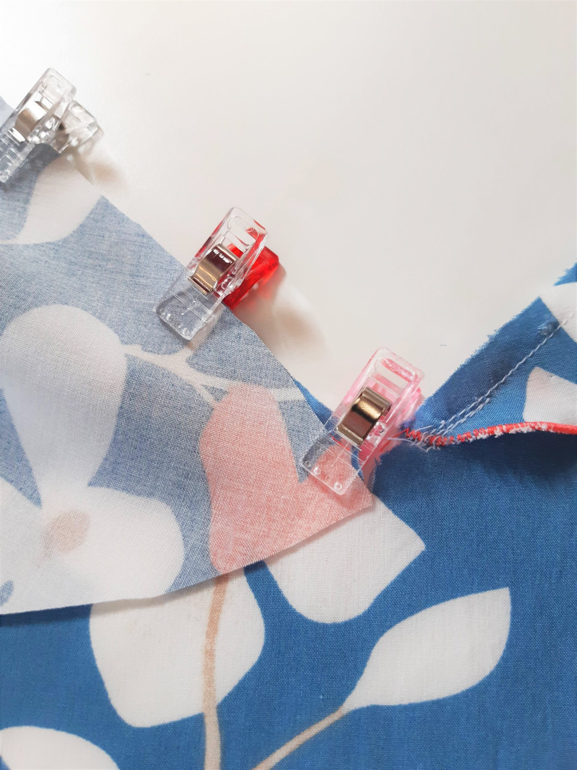 2. Stecke die Schulterkanten mit Stecknadeln oder Clipsen zusammen und schließe sie mit einem Geradstich oder einer Overlock.
